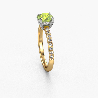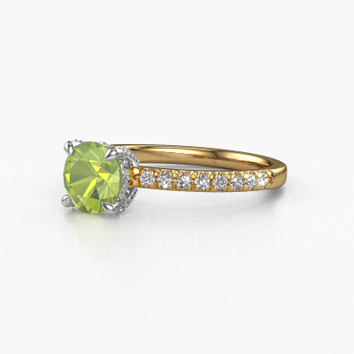 La bague de fiançailles mentionnée ci-dessus a été nommée Saskia rnd 1. Ce type de bague de fiançailles est appelé une bague de fiançailles solitaire pavé car elle ne comporte qu’une seule pierre centrale et les tiges de la bague de fiançailles sont également pleins. La bague de fiançailles est faite dans une combinaison d'or 14 Carat et d’or blanc et a un péridot ronds d’une de 6.5 mm, et des diamants synthétiques sont sertis sur les épaules de l’anneau. Chaque bijou est faite avec passion et amour par l'un de nos maîtres orfèvres. Cette bague de fiançailles solitaire pavé forgée en or jaune exclusives a un beau péridots ronds comme pierre centrale, avec plus de péridots sertis dans la bague pour accentuer encore plus la présence de la pierre centrale. Le sertissage à griffes autour du péridot étant ouvert, le péridot capte la lumière de tous les côtés et brille de manière optimale. Ci-dessus, vous pouvez voir comment notre orfèvre travaille la bague de fiançailles avec une extrême précision dans les moindres détails, de telle sorte que le péridot élevé puisse attirer tous les regards. Quelle belle bague de fiançailles à offrir lors de votre demande en mariage à l'amour de votre vie, à votre centre rayonnant ! En combinant les dernières techniques modernes, associées à une fabrication ancienne, nous sommes en mesure de fabriquer nos bagues de fiançailles dans notre propre studio. Chaque bijou est fabriqué sur commande. Ceci est avantageux car nous sommes en mesure de vous proposer un prix que vous ne trouverez nulle part ailleurs.Avez-vous déjà des bague de fiançailles spécifiques en tête ? Une bague de fiançailles que vous avez vu quelque part. N'hésitez pas à nous faire part de vos souhaits et nous transformerons votre design en des bague de fiançailles uniques. Vous êtes en mesure de suivre l'évolution de la conception de vos bague de fiançailles car nous utilisons des dessins en 3D. Cela vous donnera un aperçu réaliste de votre design. Nous vous enverrons volontiers une offre sans engagement basée sur un rapport qualité / prix juste. Elle va vous étonner.Pour vous faciliter la tâche, vous pouvez facilement nous retourner tout bijou commandé dans les 30 jours suivant la livraison.