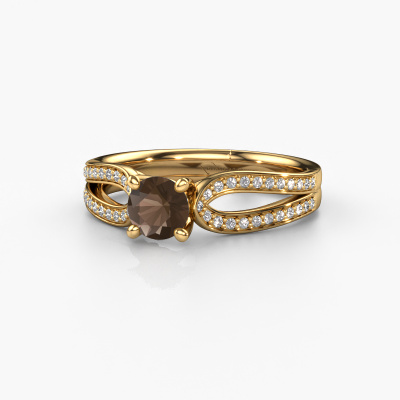La bague de fiançailles mentionnée ci-dessus a été nommée Antonia rnd 2. Ce type de bague de fiançailles est appelé une bague de fiançailles solitaire pavé car elle ne comporte qu’une seule pierre centrale et les tiges de la bague de fiançailles sont également pleins. La bague de fiançailles est faite dans une combinaison d'or 14 Carat et d’or jaune et a un quartz fumé ronds d’une de 5 mm, et des diamants sont sertis sur les épaules de l’anneau. Chaque bijou est spécialement conçues pour vous, avec une attention particulière portée aux détails et au design. Cette bague de fiançailles solitaire pavé forgée en or jaune traditionnelles a un beau quartz fumé ronds comme pierre centrale, avec plus de quartz fumé sertis dans la bague pour accentuer encore plus la présence de la pierre centrale. Le sertissage à griffes autour du quartz fumé étant ouvert, le quartz fumé capte la lumière de tous les côtés et brille de manière optimale. Ci-dessus, vous pouvez voir comment notre orfèvre travaille la bague de fiançailles avec une extrême précision dans les moindres détails, de telle sorte que le quartz fumé élevé puisse attirer tous les regards. Quelle belle bague de fiançailles à offrir lors de votre demande en mariage à l'amour de votre vie, à votre centre rayonnant ! Nos orfèvres ne fabriqueront votre bague de fiançailles qu'une fois que vous l'aurez commandée. Nous ne faisons pas de stock. L'avantage de cela est que nous n'avons pas à inclure les frais de stockage dans nos prix, et nous pouvons donc vous offrir des bijoux à un prix très bas.Avez-vous déjà des bague de fiançailles spécifiques en tête ? Une bague de fiançailles que vous avez vu quelque part. N'hésitez pas à nous faire part de vos souhaits et nous transformerons votre design en des bague de fiançailles uniques. Vous êtes en mesure de suivre l'évolution de la conception de vos bague de fiançailles car nous utilisons des dessins en 3D. Cela vous donnera un aperçu réaliste de votre design. Nous vous enverrons volontiers une offre sans engagement basée sur un rapport qualité / prix juste. Elle va vous étonner.Pour vous faciliter la tâche, vous pouvez facilement nous retourner tout bijou commandé dans les 30 jours suivant la livraison.
