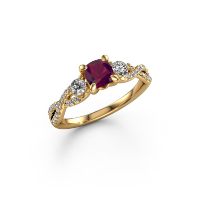La bague de fiançailles mentionnée ci-dessus a été nommée Marilou CUS. Ce type de bague de fiançailles est appelé une bague de fiançailles trois pierres car elle ne comporte qu’une seule pierre centrale et les tiges de la bague de fiançailles sont également pleins. La bague de fiançailles est faite dans une combinaison d'or 14 Carat et d’or jaune et a un rhodolite coussin d’une de 5 mm, et des diamants sont sertis sur les épaules de l’anneau. Chaque bijou est unique car vous pouvez entièrement l'assembler à votre guise. Cette bague de fiançailles trois pierres forgée en or jaune traditionnelles a un beau rhodolites coussin comme pierre centrale, avec plus de rhodolites sertis dans la bague pour accentuer encore plus la présence de la pierre centrale. Le sertissage à griffes autour du rhodolite étant ouvert, le rhodolite capte la lumière de tous les côtés et brille de manière optimale. Ci-dessus, vous pouvez voir comment notre orfèvre travaille la bague de fiançailles avec une extrême précision dans les moindres détails, de telle sorte que le rhodolite élevé puisse attirer tous les regards. Quelle belle bague de fiançailles à offrir lors de votre demande en mariage à l'amour de votre vie, à votre centre rayonnant ! En combinant les dernières techniques modernes, associées à une fabrication ancienne, nous sommes en mesure de fabriquer nos bagues de fiançailles dans notre propre studio. Chaque bijou est fabriqué sur commande. Ceci est avantageux car nous sommes en mesure de vous proposer un prix que vous ne trouverez nulle part ailleurs.Notre équipe ajoute quotidiennement de nouveaux modèles à notre collection en ligne. Nos designers et orfèvres travaillent ensemble pour créer le meilleur design. Nous nous efforçons d'offrir une collection diversifiée de bijoux. Peut-être avez-vous déjà en tête un bijou en particulier ? Un bijou que vous avez trouvé quelque part. Veuillez nous contacter pour une consultation gratuite. Nous vous ferons une offre, basée sur un rapport qualité / prix juste, qui vous déconcertera.Pour vous faciliter la tâche, vous pouvez facilement nous retourner tout bijou commandé dans les 30 jours suivant la livraison.