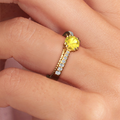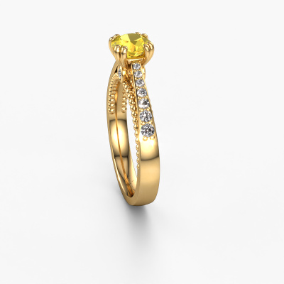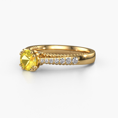 La bague de fiançailles mentionnée ci-dessus a été nommée Rozella. Ce type de bague de fiançailles est appelé une bague de fiançailles solitaire pavé car elle ne comporte qu’une seule pierre centrale et les tiges de la bague de fiançailles sont également pleins. La bague de fiançailles est faite dans une combinaison d'or 14 Carat et d’or jaune et a un saphir jaune ronds d’une de 5.5 mm, et des diamants synthétiques sont sertis sur les épaules de l’anneau. Chaque bijou est fabriquées avec passion et amour par l'un de nos maîtres orfèvres. Cette bague de fiançailles solitaire pavé forgée en or jaune uniques a un beau saphirs jaunes ronds comme pierre centrale, avec plus de saphirs jaunes sertis dans la bague pour accentuer encore plus la présence de la pierre centrale. Le sertissage à griffes autour du saphir jaune étant ouvert, le saphir jaune capte la lumière de tous les côtés et brille de manière optimale. Ci-dessus, vous pouvez voir comment notre orfèvre travaille la bague de fiançailles avec une extrême précision dans les moindres détails, de telle sorte que le saphir jaune élevé puisse attirer tous les regards. Quelle belle bague de fiançailles à offrir lors de votre demande en mariage à l'amour de votre vie, à votre centre rayonnant ! Nos orfèvres ne fabriqueront votre bague de fiançailles qu'une fois que vous l'aurez commandée. Nous ne faisons pas de stock. L'avantage de cela est que nous n'avons pas à inclure les frais de stockage dans nos prix, et nous pouvons donc vous offrir des bijoux à un prix très bas.Notre équipe de designers talentueux et passionnés ajoute chaque jour de nouveaux modèles bague de fiançailles à notre collection en ligne. Notre objectif est de pouvoir vous offrir une grande variété de bijoux. N'hésitez pas à demander un devis si vous avez des souhaits spécifiques pour votre bague de fiançailles. Nous garantissons de vous faire une offre que vous ne pourrez pas refuser.Pour vous faciliter la tâche, vous pouvez facilement nous retourner tout bijou commandé dans les 30 jours suivant la livraison.