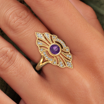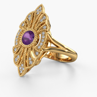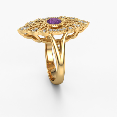 Cette bague de fiançailles porte le nom Hanna. Cette bague de fiançailles forgée en or 14 Carat est sertie d’un améthyste de 5 mm. Cette bague de fiançailles forgée en or jaune en filigrane est un chef-d’œuvre en soi. Un magnifique design de fils sophistiqués qui forment un ensemble unique. Et simultanément, un beau défi pour nos orfèvres passionnés ! Avec un grand dévouement, de la patience et une grande précision, ils forgent cette bague de fiançailles spécialement pour votre bien-aimée. Tout est fabriqué à la main, de telle sorte que chaque fil puisse être parfaitement travaillé dans les moindres détails. Un long processus de forgeage, de travail et de polissage, jusqu'à ce que le maître forgeron, gardant la bague de fiançailles à la lumière, soit satisfait du résultat... Une bague de fiançailles parfaite dont il est vraiment fier. C'est la raison pour laquelle cette bague de fiançailles en filigrane vintage est aussi une large bague de fiançailles à offrir à l'amour de votre vie ! Vous allez bientôt faire votre demande à cette personne, et cette bague de fiançailles unique n’est faite que pour cette seule personne ! Merveilleux, non ? Ce bijou est faite pour briller sur votre doigt, chaque bijou est fabriqué à la main par nos orfèvres.Saviez-vous que nous offrons la garantie du meilleur prix pour votre bague de fiançailles? Cela est possible car tous nos bijoux sont fabriqués à la main dans notre propre atelier. Nous n'avons pas de frais de stocks qui sont coûteux, et nous fabriquons votre bague uniquement une fois que vous l'avez commandée. Grâce au fait que nous ayons toute la production du bijou en main, nous pouvons vous informer sur toutes les caractéristiques de cette bague de fiançailles. C’est précisément parce que l’achat d’une bague en ligne est une expérience excitante que nous comprenons qu’il est plus confortable pour vous de connaître toutes les caractéristiques de votre bague.Notre équipe ajoute quotidiennement de nouveaux modèles à notre collection en ligne. Nos designers et orfèvres travaillent ensemble pour créer le meilleur design. Nous nous efforçons d'offrir une collection diversifiée de bijoux. Peut-être avez-vous déjà en tête un bijou en particulier ? Un bijou que vous avez trouvé quelque part. Veuillez nous contacter pour une consultation gratuite. Nous vous ferons une offre, basée sur un rapport qualité / prix juste, qui vous déconcertera.Pour vous faciliter la tâche, vous pouvez facilement nous retourner tout bijou commandé dans les 30 jours suivant la livraison.