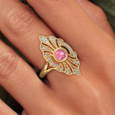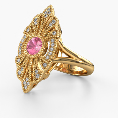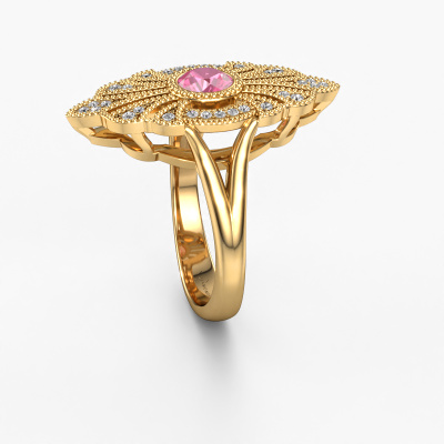 Cette bague de fiançailles porte le nom Hanna. Cette bague de fiançailles forgée en or 14 Carat est sertie d’un saphir rose de 5 mm. Cette bague de fiançailles forgée en or jaune en filigrane est un chef-d’œuvre en soi. Un magnifique design de fils sophistiqués qui forment un ensemble unique. Et simultanément, un beau défi pour nos orfèvres passionnés ! Avec un grand dévouement, de la patience et une grande précision, ils forgent cette bague de fiançailles spécialement pour votre bien-aimée. Tout est fabriqué à la main, de telle sorte que chaque fil puisse être parfaitement travaillé dans les moindres détails. Un long processus de forgeage, de travail et de polissage, jusqu'à ce que le maître forgeron, gardant la bague de fiançailles à la lumière, soit satisfait du résultat... Une bague de fiançailles parfaite dont il est vraiment fier. C'est la raison pour laquelle cette bague de fiançailles en filigrane vintage est aussi une large bague de fiançailles à offrir à l'amour de votre vie ! Vous allez bientôt faire votre demande à cette personne, et cette bague de fiançailles unique n’est faite que pour cette seule personne ! Merveilleux, non ? Ce bijou est faite pour briller sur votre doigt, chaque bijou est fabriqué à la main par nos orfèvres.Saviez-vous que nous offrons la garantie du meilleur prix pour votre bague de fiançailles? Cela est possible car tous nos bijoux sont fabriqués à la main dans notre propre atelier. Nous n'avons pas de frais de stocks qui sont coûteux, et nous fabriquons votre bague uniquement une fois que vous l'avez commandée. Grâce au fait que nous ayons toute la production du bijou en main, nous pouvons vous informer sur toutes les caractéristiques de cette bague de fiançailles. C’est précisément parce que l’achat d’une bague en ligne est une expérience excitante que nous comprenons qu’il est plus confortable pour vous de connaître toutes les caractéristiques de votre bague.Notre équipe ajoute quotidiennement de nouveaux modèles à notre collection en ligne. Nos designers et orfèvres travaillent ensemble pour créer le meilleur design. Nous nous efforçons d'offrir une collection diversifiée de bijoux. Peut-être avez-vous déjà en tête un bijou en particulier ? Un bijou que vous avez trouvé quelque part. Veuillez nous contacter pour une consultation gratuite. Nous vous ferons une offre, basée sur un rapport qualité / prix juste, qui vous déconcertera.Pour vous faciliter la tâche, vous pouvez facilement nous retourner tout bijou commandé dans les 30 jours suivant la livraison.