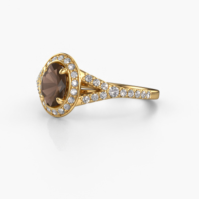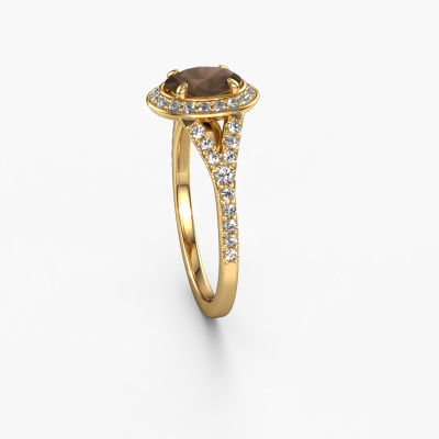 La bague de fiançailles mentionnée ci-dessus est nommée Pamela OVL. Nous appelons ce type de bague de fiançailles une bague Halo. La bague de fiançailles est forgée en or 14 Carat et comporte un quartz fumé ovale de la de 7x5 mm et autour duquel sont sertis de petits diamants synthétiques. La largeur de cette bague de fiançailles halo forgée en or jaune luxes vient des plus petites pierres précieuses qui sont serties autour du large quartz fumé central. C’est également ce à partir de quoi cette belle bague de fiançailles tire son nom : halo signifie halo et c’est aussi l’effet que rendent les pierres précieuses plus petites. Cependant, ces pierres précieuses plus petites doivent toutes être serties de la même manière, afin que la lumière ne soit pas seulement introduite dans le quartz fumé et qu’un véritable halo de lumière soit créé. Et c'est ce que font nos maîtres orfèvres. Avec la plus grande précision, chaque quartz fumé soigneusement sélectionné est placé à la main dans la bague de fiançailles. Encore et encore, la bague de fiançailles est maintenue à la lumière pour voir si l'effet spécial est toujours visible. Le résultat est une bague de fiançailles unique, où le quartz fumé choisi devient littéralement le centre brillants. Vous pouvez imaginer que cette bague de fiançailles est vraiment une bague de fiançailles significative à offrir à votre amour de la vie ! Le jour où vous montrez qu’elle est votre centre brillants ! Qu'y a-t-il dorénavant de plus beau qu'une bague de fiançailles luxes conçue par vous-même et fabriquée à la main par nous. Vous pouvez personnaliser chaque modèle avec les différents métaux précieux et pierres précieuses. De cette façon, vous pourrez créer une bague de fiançailles unique. Cette bague peut être mise en place de plusieurs façons. Bien sûr, vous pouvez toujours nous contacter et nous serons heureux de vous aider à composer votre bague de fiançailles luxes Pamela OVL. Vous aimez le design, mais vous souhaitez tout de même quelque chose qui vous convienne plus, ou bien vous souhaitez une pierre précieuse dans les bijoux que vous ne pouvez pas choisir sur notre site, contactez-nous et nous vous aiderons.Notre équipe ajoute quotidiennement de nouveaux modèles à notre collection en ligne. Nos designers et orfèvres travaillent ensemble pour créer le meilleur design. Nous nous efforçons d'offrir une collection diversifiée de bijoux. Peut-être avez-vous déjà en tête un bijou en particulier ? Un bijou que vous avez trouvé quelque part. Veuillez nous contacter pour une consultation gratuite. Nous vous ferons une offre, basée sur un rapport qualité / prix juste, qui vous déconcertera.Pour vous faciliter la tâche, vous pouvez facilement nous retourner tout bijou commandé dans les 30 jours suivant la livraison.