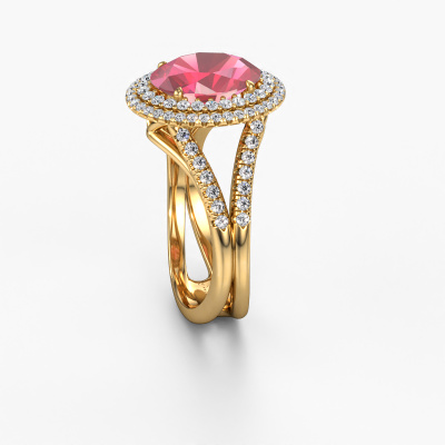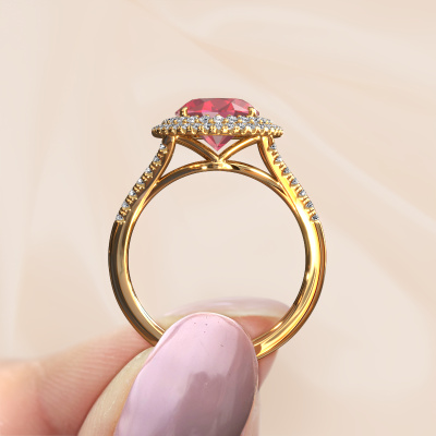 La bague de fiançailles mentionnée ci-dessus est nommée Elvie. Nous appelons ce type de bague de fiançailles une bague Halo. La bague de fiançailles est forgée en or 14 Carat et comporte un rose tourmaline ovale de la de 10x8 mm et autour duquel sont sertis de petits diamants synthétiques. La largeur de cette bague de fiançailles solitaire pavé forgée en or jaune vintage vient des plus petites pierres précieuses qui sont serties autour du large rose tourmaline central. C’est également ce à partir de quoi cette belle bague de fiançailles tire son nom : solitaire pavé signifie halo et c’est aussi l’effet que rendent les pierres précieuses plus petites. Cependant, ces pierres précieuses plus petites doivent toutes être serties de la même manière, afin que la lumière ne soit pas seulement introduite dans le rose tourmaline et qu’un véritable halo de lumière soit créé. Et c'est ce que font nos maîtres orfèvres. Avec la plus grande précision, chaque rose tourmaline soigneusement sélectionné est placé à la main dans la bague de fiançailles. Encore et encore, la bague de fiançailles est maintenue à la lumière pour voir si l'effet spécial est toujours visible. Le résultat est une bague de fiançailles unique, où le rose tourmaline choisi devient littéralement le centre brillants. Vous pouvez imaginer que cette bague de fiançailles est vraiment une bague de fiançailles significative à offrir à votre amour de la vie ! Le jour où vous montrez qu’elle est votre centre brillants ! Qu'y a-t-il dorénavant de plus beau qu'une bague de fiançailles vintage conçue par vous-même et fabriquée à la main par nous. Vous pouvez personnaliser chaque modèle avec les différents métaux précieux et pierres précieuses. De cette façon, vous pourrez créer une bague de fiançailles unique. Cette bague peut être mise en place de plusieurs façons. Bien sûr, vous pouvez toujours nous contacter et nous serons heureux de vous aider à composer votre bague de fiançailles vintage Elvie. Vous aimez le design, mais vous souhaitez tout de même quelque chose qui vous convienne plus, ou bien vous souhaitez une pierre précieuse dans les bijoux que vous ne pouvez pas choisir sur notre site, contactez-nous et nous vous aiderons.Avez-vous déjà des bague de fiançailles spécifiques en tête ? Une bague de fiançailles que vous avez vu quelque part. N'hésitez pas à nous faire part de vos souhaits et nous transformerons votre design en des bague de fiançailles uniques. Vous êtes en mesure de suivre l'évolution de la conception de vos bague de fiançailles car nous utilisons des dessins en 3D. Cela vous donnera un aperçu réaliste de votre design. Nous vous enverrons volontiers une offre sans engagement basée sur un rapport qualité / prix juste. Elle va vous étonner.Pour vous faciliter la tâche, vous pouvez facilement nous retourner tout bijou commandé dans les 30 jours suivant la livraison.