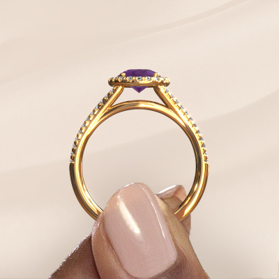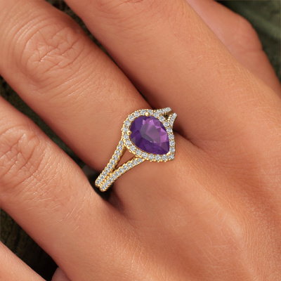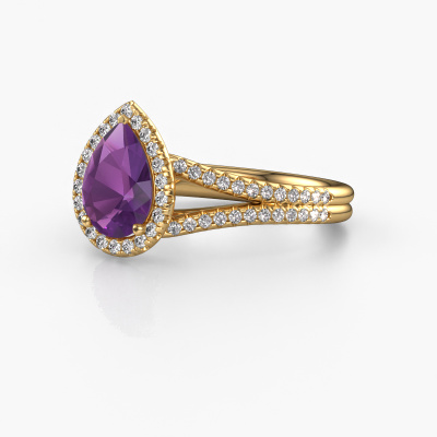 La bague de fiançailles mentionnée ci-dessus est nommée Verla pear 2. Nous appelons ce type de bague de fiançailles une bague Halo. La bague de fiançailles est forgée en or 14 Carat et comporte un améthyste poire de la de 8x6 mm et autour duquel sont sertis de petits diamants. La largeur de cette bague de fiançailles halo forgée en or jaune exclusives vient des plus petites pierres précieuses qui sont serties autour du large améthyste central. C’est également ce à partir de quoi cette belle bague de fiançailles tire son nom : halo signifie halo et c’est aussi l’effet que rendent les pierres précieuses plus petites. Cependant, ces pierres précieuses plus petites doivent toutes être serties de la même manière, afin que la lumière ne soit pas seulement introduite dans le améthyste et qu’un véritable halo de lumière soit créé. Et c'est ce que font nos maîtres orfèvres. Avec la plus grande précision, chaque améthyste soigneusement sélectionné est placé à la main dans la bague de fiançailles. Encore et encore, la bague de fiançailles est maintenue à la lumière pour voir si l'effet spécial est toujours visible. Le résultat est une bague de fiançailles unique, où le améthyste choisi devient littéralement le centre brillants. Vous pouvez imaginer que cette bague de fiançailles est vraiment une bague de fiançailles significative à offrir à votre amour de la vie ! Le jour où vous montrez qu’elle est votre centre brillants ! Saviez-vous que nous offrons la garantie du meilleur prix pour votre bague de fiançailles? Cela est possible car tous nos bijoux sont fabriqués à la main dans notre propre atelier. Nous n'avons pas de frais de stocks qui sont coûteux, et nous fabriquons votre bague uniquement une fois que vous l'avez commandée. Grâce au fait que nous ayons toute la production du bijou en main, nous pouvons vous informer sur toutes les caractéristiques de cette bague de fiançailles. C’est précisément parce que l’achat d’une bague en ligne est une expérience excitante que nous comprenons qu’il est plus confortable pour vous de connaître toutes les caractéristiques de votre bague.Notre équipe de designers talentueux et passionnés ajoute chaque jour de nouveaux modèles bague de fiançailles à notre collection en ligne. Notre objectif est de pouvoir vous offrir une grande variété de bijoux. N'hésitez pas à demander un devis si vous avez des souhaits spécifiques pour votre bague de fiançailles. Nous garantissons de vous faire une offre que vous ne pourrez pas refuser.Pour vous faciliter la tâche, vous pouvez facilement nous retourner tout bijou commandé dans les 30 jours suivant la livraison.