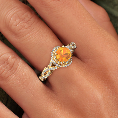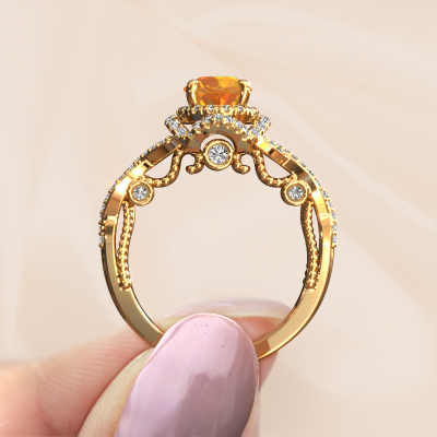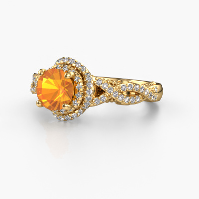 La bague de fiançailles mentionnée ci-dessus est nommée Leora. Nous appelons ce type de bague de fiançailles une bague Halo. La bague de fiançailles est forgée en or 14 Carat et comporte un citrine ronds de la de 6.5 mm et autour duquel sont sertis de petits diamants synthétiques. La largeur de cette bague de fiançailles halo forgée en or jaune vintage vient des plus petites pierres précieuses qui sont serties autour du large citrine central. C’est également ce à partir de quoi cette belle bague de fiançailles tire son nom : halo signifie halo et c’est aussi l’effet que rendent les pierres précieuses plus petites. Cependant, ces pierres précieuses plus petites doivent toutes être serties de la même manière, afin que la lumière ne soit pas seulement introduite dans le citrine et qu’un véritable halo de lumière soit créé. Et c'est ce que font nos maîtres orfèvres. Avec la plus grande précision, chaque citrine soigneusement sélectionné est placé à la main dans la bague de fiançailles. Encore et encore, la bague de fiançailles est maintenue à la lumière pour voir si l'effet spécial est toujours visible. Le résultat est une bague de fiançailles unique, où le citrine choisi devient littéralement le centre brillants. Vous pouvez imaginer que cette bague de fiançailles est vraiment une bague de fiançailles significative à offrir à votre amour de la vie ! Le jour où vous montrez qu’elle est votre centre brillants ! Qu'y a-t-il dorénavant de plus beau qu'une bague de fiançailles vintage conçue par vous-même et fabriquée à la main par nous. Vous pouvez personnaliser chaque modèle avec les différents métaux précieux et pierres précieuses. De cette façon, vous pourrez créer une bague de fiançailles unique. Cette bague peut être mise en place de plusieurs façons. Bien sûr, vous pouvez toujours nous contacter et nous serons heureux de vous aider à composer votre bague de fiançailles vintage Leora. Vous aimez le design, mais vous souhaitez tout de même quelque chose qui vous convienne plus, ou bien vous souhaitez une pierre précieuse dans les bijoux que vous ne pouvez pas choisir sur notre site, contactez-nous et nous vous aiderons.Notre équipe de designers talentueux et passionnés ajoute chaque jour de nouveaux modèles bague de fiançailles à notre collection en ligne. Notre objectif est de pouvoir vous offrir une grande variété de bijoux. N'hésitez pas à demander un devis si vous avez des souhaits spécifiques pour votre bague de fiançailles. Nous garantissons de vous faire une offre que vous ne pourrez pas refuser.Pour vous faciliter la tâche, vous pouvez facilement nous retourner tout bijou commandé dans les 30 jours suivant la livraison.
