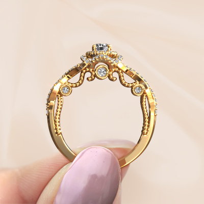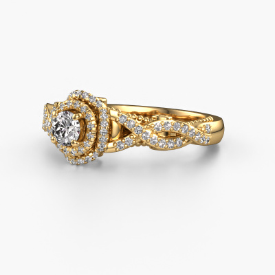La bague de fiançailles mentionnée ci-dessus est nommée Leora. Nous appelons ce type de bague de fiançailles une bague Halo. La bague de fiançailles est forgée en or 14 Carat et comporte un diamant ronds de la de 0.25 crt et autour duquel sont sertis de petits diamants synthétiques. La largeur de cette bague de fiançailles halo forgée en or jaune vintage vient des plus petites pierres précieuses qui sont serties autour du large diamant central. C’est également ce à partir de quoi cette belle bague de fiançailles tire son nom : halo signifie halo et c’est aussi l’effet que rendent les pierres précieuses plus petites. Cependant, ces pierres précieuses plus petites doivent toutes être serties de la même manière, afin que la lumière ne soit pas seulement introduite dans le diamant et qu’un véritable halo de lumière soit créé. Et c'est ce que font nos maîtres orfèvres. Avec la plus grande précision, chaque diamant soigneusement sélectionné est placé à la main dans la bague de fiançailles. Encore et encore, la bague de fiançailles est maintenue à la lumière pour voir si l'effet spécial est toujours visible. Le résultat est une bague de fiançailles unique, où le diamant choisi devient littéralement le centre brillants. Vous pouvez imaginer que cette bague de fiançailles est vraiment une bague de fiançailles significative à offrir à votre amour de la vie ! Le jour où vous montrez qu’elle est votre centre brillants ! Qu'y a-t-il dorénavant de plus beau qu'une bague de fiançailles vintage conçue par vous-même et fabriquée à la main par nous. Vous pouvez personnaliser chaque modèle avec les différents métaux précieux et pierres précieuses. De cette façon, vous pourrez créer une bague de fiançailles unique. Cette bague peut être mise en place de plusieurs façons. Bien sûr, vous pouvez toujours nous contacter et nous serons heureux de vous aider à composer votre bague de fiançailles vintage Leora. Vous aimez le design, mais vous souhaitez tout de même quelque chose qui vous convienne plus, ou bien vous souhaitez une pierre précieuse dans les bijoux que vous ne pouvez pas choisir sur notre site, contactez-nous et nous vous aiderons.Notre équipe de designers talentueux et passionnés ajoute chaque jour de nouveaux modèles bague de fiançailles à notre collection en ligne. Notre objectif est de pouvoir vous offrir une grande variété de bijoux. N'hésitez pas à demander un devis si vous avez des souhaits spécifiques pour votre bague de fiançailles. Nous garantissons de vous faire une offre que vous ne pourrez pas refuser.Pour vous faciliter la tâche, vous pouvez facilement nous retourner tout bijou commandé dans les 30 jours suivant la livraison.