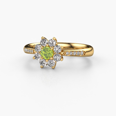 La bague de fiançailles présentée ci-dessus a été nommée Camille 2. Nous appelons ce type de bague de fiançailles une bague flower, dans laquelle de petites pierres précieuses sont serties autour de la pierre centrale dans un sertissage ouvert. Cette bague de fiançailles forgée en or 14 Carat a un péridot ronds de 3.4 mm en guise de pierre centrale qui est aussi entourée de petits diamants. Si vous regardez cette bague de fiançailles flower forgée en or jaune, vous avez l'impression que les plus petites pierres précieuses, ainsi que le grand péridot, fusionnent en une seule grosse pierre scintillante, sous la forme d’une belle fleur. Cette bague de fiançailles peut aussi avoir un autre nom tel que bague fleur ou la bague rosette. Cependant, les diamants plus petits doivent tous être sertis de la même manière, afin que la lumière passant au travers du péridot ne soit pas interrompue et qu'une véritable unité soit créée. Voici donc le travail de nos maîtres orfèvres. Avec la plus grande précision, chaque péridot soigneusement sélectionné est serti à la main dans la bague de fiançailles. Toujours et encore, la bague de fiançailles est surveillée de près sous la lumière pour voir si l'effet spécial désiré est toujours visible. Puisque nous concevons et livrons nos propres bijoux, nous sommes en mesure de vous proposer une bague de fiançailles à un prix que vous ne pourrez pas trouver ailleurs. Une alliance est fabriquée sur commande, ce qui permet d'éviter les excédents de matériel et nous permet de vous proposer une superbe offre de prix. Nous comprenons qu'acheter votre bague de fiançailles en ligne soit un risque, mais nous vous assistons volontiers dans le processus de conception, en tenant compte de votre budget.Notre équipe ajoute quotidiennement de nouveaux modèles à notre collection en ligne. Nos designers et orfèvres travaillent ensemble pour créer le meilleur design. Nous nous efforçons d'offrir une collection diversifiée de bijoux. Peut-être avez-vous déjà en tête un bijou en particulier ? Un bijou que vous avez trouvé quelque part. Veuillez nous contacter pour une consultation gratuite. Nous vous ferons une offre, basée sur un rapport qualité / prix juste, qui vous déconcertera.Pour vous faciliter la tâche, vous pouvez facilement nous retourner tout bijou commandé dans les 30 jours suivant la livraison.