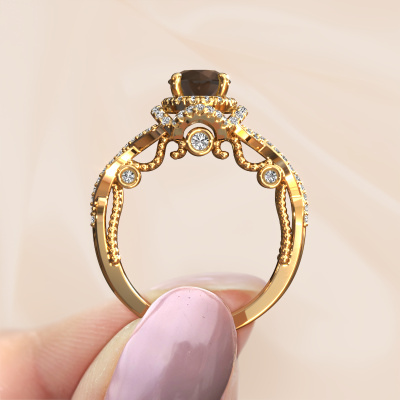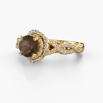La bague de fiançailles mentionnée ci-dessus est nommée Leora. Nous appelons ce type de bague de fiançailles une bague Halo. La bague de fiançailles est forgée en or 14 Carat et comporte un quartz fumé ronds de la de 6.5 mm et autour duquel sont sertis de petits diamants synthétiques. La largeur de cette bague de fiançailles halo forgée en or jaune vintage vient des plus petites pierres précieuses qui sont serties autour du large quartz fumé central. C’est également ce à partir de quoi cette belle bague de fiançailles tire son nom : halo signifie halo et c’est aussi l’effet que rendent les pierres précieuses plus petites. Cependant, ces pierres précieuses plus petites doivent toutes être serties de la même manière, afin que la lumière ne soit pas seulement introduite dans le quartz fumé et qu’un véritable halo de lumière soit créé. Et c'est ce que font nos maîtres orfèvres. Avec la plus grande précision, chaque quartz fumé soigneusement sélectionné est placé à la main dans la bague de fiançailles. Encore et encore, la bague de fiançailles est maintenue à la lumière pour voir si l'effet spécial est toujours visible. Le résultat est une bague de fiançailles unique, où le quartz fumé choisi devient littéralement le centre brillants. Vous pouvez imaginer que cette bague de fiançailles est vraiment une bague de fiançailles significative à offrir à votre amour de la vie ! Le jour où vous montrez qu’elle est votre centre brillants ! Qu'y a-t-il dorénavant de plus beau qu'une bague de fiançailles vintage conçue par vous-même et fabriquée à la main par nous. Vous pouvez personnaliser chaque modèle avec les différents métaux précieux et pierres précieuses. De cette façon, vous pourrez créer une bague de fiançailles unique. Cette bague peut être mise en place de plusieurs façons. Bien sûr, vous pouvez toujours nous contacter et nous serons heureux de vous aider à composer votre bague de fiançailles vintage Leora. Vous aimez le design, mais vous souhaitez tout de même quelque chose qui vous convienne plus, ou bien vous souhaitez une pierre précieuse dans les bijoux que vous ne pouvez pas choisir sur notre site, contactez-nous et nous vous aiderons.Notre équipe de designers talentueux et passionnés ajoute chaque jour de nouveaux modèles bague de fiançailles à notre collection en ligne. Notre objectif est de pouvoir vous offrir une grande variété de bijoux. N'hésitez pas à demander un devis si vous avez des souhaits spécifiques pour votre bague de fiançailles. Nous garantissons de vous faire une offre que vous ne pourrez pas refuser.Pour vous faciliter la tâche, vous pouvez facilement nous retourner tout bijou commandé dans les 30 jours suivant la livraison.