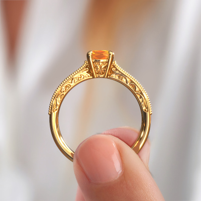 Cette bague de fiançailles porte le nom Shonta CUS. Cette bague de fiançailles forgée en or 14 Carat est sertie d’un citrine de 5.5 mm. Cette bague de fiançailles forgée en or jaune en filigrane est un chef-d’œuvre en soi. Un magnifique design de fils sophistiqués qui forment un ensemble unique. Et simultanément, un beau défi pour nos orfèvres passionnés ! Avec un grand dévouement, de la patience et une grande précision, ils forgent cette bague de fiançailles spécialement pour votre bien-aimée. Tout est fabriqué à la main, de telle sorte que chaque fil puisse être parfaitement travaillé dans les moindres détails. Un long processus de forgeage, de travail et de polissage, jusqu'à ce que le maître forgeron, gardant la bague de fiançailles à la lumière, soit satisfait du résultat... Une bague de fiançailles parfaite dont il est vraiment fier. C'est la raison pour laquelle cette bague de fiançailles en filigrane vintage est aussi une large bague de fiançailles à offrir à l'amour de votre vie ! Vous allez bientôt faire votre demande à cette personne, et cette bague de fiançailles unique n’est faite que pour cette seule personne ! Merveilleux, non ? Ce bijou est faite pour briller sur votre doigt, chaque bijou est fabriqué à la main par nos orfèvres.Nos orfèvres ne fabriqueront votre bague de fiançailles qu'une fois que vous l'aurez commandée. Nous ne faisons pas de stock. L'avantage de cela est que nous n'avons pas à inclure les frais de stockage dans nos prix, et nous pouvons donc vous offrir des bijoux à un prix très bas.Notre équipe de designers talentueux et passionnés ajoute chaque jour de nouveaux modèles bague de fiançailles à notre collection en ligne. Notre objectif est de pouvoir vous offrir une grande variété de bijoux. N'hésitez pas à demander un devis si vous avez des souhaits spécifiques pour votre bague de fiançailles. Nous garantissons de vous faire une offre que vous ne pourrez pas refuser.Pour vous faciliter la tâche, vous pouvez facilement nous retourner tout bijou commandé dans les 30 jours suivant la livraison.
