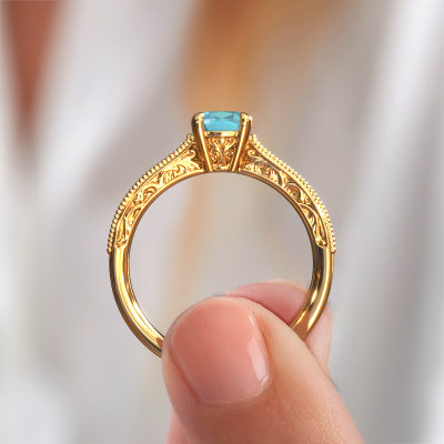 Cette bague de fiançailles porte le nom Shonta CUS. Cette bague de fiançailles forgée en or 14 Carat est sertie d’un topaze bleue de 5.5 mm. Cette bague de fiançailles forgée en or jaune en filigrane est un chef-d’œuvre en soi. Un magnifique design de fils sophistiqués qui forment un ensemble unique. Et simultanément, un beau défi pour nos orfèvres passionnés ! Avec un grand dévouement, de la patience et une grande précision, ils forgent cette bague de fiançailles spécialement pour votre bien-aimée. Tout est fabriqué à la main, de telle sorte que chaque fil puisse être parfaitement travaillé dans les moindres détails. Un long processus de forgeage, de travail et de polissage, jusqu'à ce que le maître forgeron, gardant la bague de fiançailles à la lumière, soit satisfait du résultat... Une bague de fiançailles parfaite dont il est vraiment fier. C'est la raison pour laquelle cette bague de fiançailles en filigrane vintage est aussi une large bague de fiançailles à offrir à l'amour de votre vie ! Vous allez bientôt faire votre demande à cette personne, et cette bague de fiançailles unique n’est faite que pour cette seule personne ! Merveilleux, non ? Ce bijou est faite pour briller sur votre doigt, chaque bijou est fabriqué à la main par nos orfèvres.Nos orfèvres ne fabriqueront votre bague de fiançailles qu'une fois que vous l'aurez commandée. Nous ne faisons pas de stock. L'avantage de cela est que nous n'avons pas à inclure les frais de stockage dans nos prix, et nous pouvons donc vous offrir des bijoux à un prix très bas.Notre équipe de designers talentueux et passionnés ajoute chaque jour de nouveaux modèles bague de fiançailles à notre collection en ligne. Notre objectif est de pouvoir vous offrir une grande variété de bijoux. N'hésitez pas à demander un devis si vous avez des souhaits spécifiques pour votre bague de fiançailles. Nous garantissons de vous faire une offre que vous ne pourrez pas refuser.Pour vous faciliter la tâche, vous pouvez facilement nous retourner tout bijou commandé dans les 30 jours suivant la livraison.