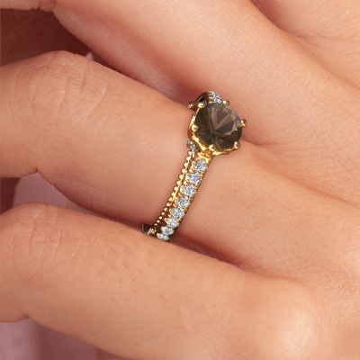 Cette bague de fiançailles porte le nom Venita. Cette bague de fiançailles forgée en or 14 Carat est sertie d’un quartz fumé. Cette bague de fiançailles unique est une large bague vintage forgée en or jaune qui laissera certainement briller l’amour de votre vie ! Et c'est exactement ce que nous avons comme objectif. De magnifiques quartz fumé ont été sertis sur cette bague de fiançailles vintage. Vous pouvez, bien entendu, utiliser chaque pierre précieuse que nous proposons sur notre site. La pierre précieuse sera sélectionnée avec soin, car nous pensons que seule la plus belle des pierres précieuses peut briller sur votre bague de fiançailles, qu’en dites-vous ? Notre orfèvre fabrique votre bague de fiançailles dans notre propre atelier et place le quartz fumé dans son anneau avec une précision extrême. Puis, elle est travaillée et polie jusqu'à ce que le résultat soit visible : la bague de fiançailles parfaite pour l'amour de votre vie ! Ce bijou est fabriquées spécialement pour vous par nos maîtres orfèvres dans notre propre atelier.Saviez-vous que nous offrons la garantie du meilleur prix pour votre bague de fiançailles? Cela est possible car tous nos bijoux sont fabriqués à la main dans notre propre atelier. Nous n'avons pas de frais de stocks qui sont coûteux, et nous fabriquons votre bague uniquement une fois que vous l'avez commandée. Grâce au fait que nous ayons toute la production du bijou en main, nous pouvons vous informer sur toutes les caractéristiques de cette bague de fiançailles. C’est précisément parce que l’achat d’une bague en ligne est une expérience excitante que nous comprenons qu’il est plus confortable pour vous de connaître toutes les caractéristiques de votre bague.Notre équipe ajoute quotidiennement de nouveaux modèles à notre collection en ligne. Nos designers et orfèvres travaillent ensemble pour créer le meilleur design. Nous nous efforçons d'offrir une collection diversifiée de bijoux. Peut-être avez-vous déjà en tête un bijou en particulier ? Un bijou que vous avez trouvé quelque part. Veuillez nous contacter pour une consultation gratuite. Nous vous ferons une offre, basée sur un rapport qualité / prix juste, qui vous déconcertera.Pour vous faciliter la tâche, vous pouvez facilement nous retourner tout bijou commandé dans les 30 jours suivant la livraison.