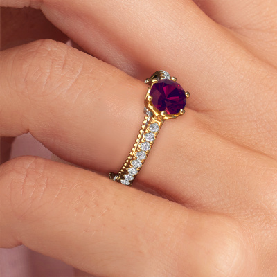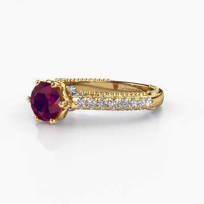 Cette bague de fiançailles porte le nom Venita. Cette bague de fiançailles forgée en or 14 Carat est sertie d’un rhodolite. Cette bague de fiançailles unique est une large bague vintage forgée en or jaune qui laissera certainement briller l’amour de votre vie ! Et c'est exactement ce que nous avons comme objectif. De magnifiques rhodolites ont été sertis sur cette bague de fiançailles vintage. Vous pouvez, bien entendu, utiliser chaque pierre précieuse que nous proposons sur notre site. La pierre précieuse sera sélectionnée avec soin, car nous pensons que seule la plus belle des pierres précieuses peut briller sur votre bague de fiançailles, qu’en dites-vous ? Notre orfèvre fabrique votre bague de fiançailles dans notre propre atelier et place le rhodolite dans son anneau avec une précision extrême. Puis, elle est travaillée et polie jusqu'à ce que le résultat soit visible : la bague de fiançailles parfaite pour l'amour de votre vie ! Ce bijou est fabriquées spécialement pour vous par nos maîtres orfèvres dans notre propre atelier.Saviez-vous que nous offrons la garantie du meilleur prix pour votre bague de fiançailles? Cela est possible car tous nos bijoux sont fabriqués à la main dans notre propre atelier. Nous n'avons pas de frais de stocks qui sont coûteux, et nous fabriquons votre bague uniquement une fois que vous l'avez commandée. Grâce au fait que nous ayons toute la production du bijou en main, nous pouvons vous informer sur toutes les caractéristiques de cette bague de fiançailles. C’est précisément parce que l’achat d’une bague en ligne est une expérience excitante que nous comprenons qu’il est plus confortable pour vous de connaître toutes les caractéristiques de votre bague.Notre équipe ajoute quotidiennement de nouveaux modèles à notre collection en ligne. Nos designers et orfèvres travaillent ensemble pour créer le meilleur design. Nous nous efforçons d'offrir une collection diversifiée de bijoux. Peut-être avez-vous déjà en tête un bijou en particulier ? Un bijou que vous avez trouvé quelque part. Veuillez nous contacter pour une consultation gratuite. Nous vous ferons une offre, basée sur un rapport qualité / prix juste, qui vous déconcertera.Pour vous faciliter la tâche, vous pouvez facilement nous retourner tout bijou commandé dans les 30 jours suivant la livraison.