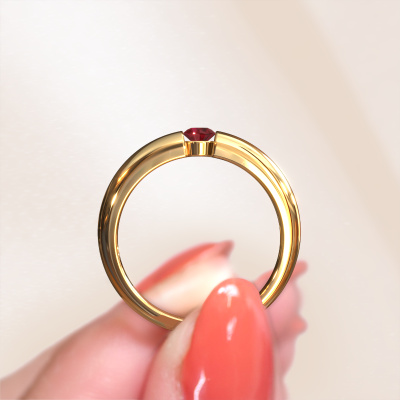 Nous appelons cette bague de fiançailles Amelia. Cette bague forgée en or 14 Carat est sertie d’un rubis. Vous recherchez une bague de fiançailles forgée en or jaune unique et au look modernes ? Voici donc une belle bague magnifique que vous pouvez entièrement ajuster à votre goût. Un rubis magnifique est utilisé dans cette bague de fiançailles modernes. Celui-ci est sélectionné avec soin, car seule les plus belles des pierres précieuses peuvent briller sur votre bague de fiançailles convexe. Notre orfèvre fabrique votre bague de fiançailles dans notre propre atelier et place le rubis dans la bague avec une précision extrême. Donc, la bague est travaillée et polie jusqu'à ce que le résultat désiré soit visible : la bague de fiançailles parfaite pour l'amour de votre vie ! En combinant les dernières techniques modernes, associées à une fabrication ancienne, nous sommes en mesure de fabriquer nos bagues de fiançailles dans notre propre studio. Chaque bijou est fabriqué sur commande. Ceci est avantageux car nous sommes en mesure de vous proposer un prix que vous ne trouverez nulle part ailleurs.Avez-vous déjà des bague de fiançailles spécifiques en tête ? Une bague de fiançailles que vous avez vu quelque part. N'hésitez pas à nous faire part de vos souhaits et nous transformerons votre design en des bague de fiançailles uniques. Vous êtes en mesure de suivre l'évolution de la conception de vos bague de fiançailles car nous utilisons des dessins en 3D. Cela vous donnera un aperçu réaliste de votre design. Nous vous enverrons volontiers une offre sans engagement basée sur un rapport qualité / prix juste. Elle va vous étonner.Pour vous faciliter la tâche, vous pouvez facilement nous retourner tout bijou commandé dans les 30 jours suivant la livraison.