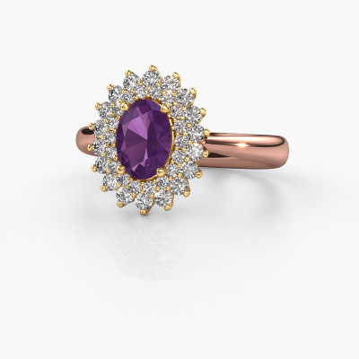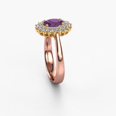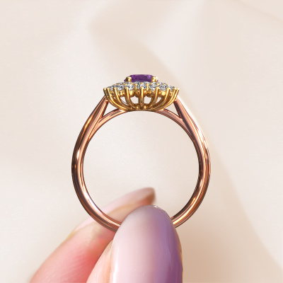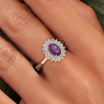 La bague de fiançailles présentée ci-dessus a été nommée Alina 1. Nous appelons ce type de bague de fiançailles une bague entourage, dans laquelle de petites pierres précieuses sont serties autour de la pierre centrale dans un sertissage ouvert. Cette bague de fiançailles forgée en or 14 Carat a un améthyste ovale de 7x5 mm en guise de pierre centrale qui est aussi entourée de petits diamants. La particularité de cette bague de fiançailles classiques forgée en or rose est sa forme : les petites pierres précieuses et le améthyste forment une belle fleur qui semble se fondre en une large pierre précieuse étincelante. Cette bague de fiançailles est aussi appelée la bague de fiançailles fleur ou rosette. Nos maîtres orfèvres veillent à ce que les plus petits diamants soient tous sertis de la même manière, afin que la lumière passant au travers du améthyste ne soit pas interrompue et qu'une belle unité soit créée. Avec un œil expérimenté et une main habile, chaque améthyste soigneusement sélectionné est serti dans la bague de fiançailles. Toujours et encore, la bague de fiançailles est examinée sous la lumière pour voir si l'effet spécial désiré est encore visible. Le résultat est une bague de fiançailles unique, où le améthyste choisi devient littéralement le centre brillants. Quelle bague de fiançailles belle et significative à offrir au centre qui brille dans votre vie ! Vous avez peut-être remarqué que nos prix sont en moyenne inférieurs de 30% à ceux d'un autre bijoutier. Et ce alors que la qualité de nos bijoux est même plus élevée dans la plupart des cas ! En effet, nos orfèvres fabriquent votre bague de fiançailles directement dans notre propre atelier. Cela signifie que nous n'avons pas à inclure des frais de stocks coûteux et que nous pouvons travailler n'importe quel détail directement sur votre bague de fiançailles.Notre équipe de designers talentueux et passionnés ajoute chaque jour de nouveaux modèles bague de fiançailles à notre collection en ligne. Notre objectif est de pouvoir vous offrir une grande variété de bijoux. N'hésitez pas à demander un devis si vous avez des souhaits spécifiques pour votre bague de fiançailles. Nous garantissons de vous faire une offre que vous ne pourrez pas refuser.Pour vous faciliter la tâche, vous pouvez facilement nous retourner tout bijou commandé dans les 30 jours suivant la livraison.