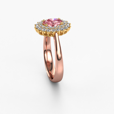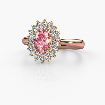 La bague de fiançailles présentée ci-dessus a été nommée Alina 1. Nous appelons ce type de bague de fiançailles une bague entourage, dans laquelle de petites pierres précieuses sont serties autour de la pierre centrale dans un sertissage ouvert. Cette bague de fiançailles forgée en or 14 Carat a un diamant synthétique roze ovale de 7x5 mm en guise de pierre centrale qui est aussi entourée de petits diamants. La particularité de cette bague de fiançailles classiques forgée en or rose est sa forme : les petites pierres précieuses et le diamant synthétique roze forment une belle fleur qui semble se fondre en une large pierre précieuse étincelante. Cette bague de fiançailles est aussi appelée la bague de fiançailles fleur ou rosette. Nos maîtres orfèvres veillent à ce que les plus petits diamants soient tous sertis de la même manière, afin que la lumière passant au travers du diamant synthétique roze ne soit pas interrompue et qu'une belle unité soit créée. Avec un œil expérimenté et une main habile, chaque diamant synthétique roze soigneusement sélectionné est serti dans la bague de fiançailles. Toujours et encore, la bague de fiançailles est examinée sous la lumière pour voir si l'effet spécial désiré est encore visible. Le résultat est une bague de fiançailles unique, où le diamant synthétique roze choisi devient littéralement le centre brillants. Quelle bague de fiançailles belle et significative à offrir au centre qui brille dans votre vie ! Vous avez peut-être remarqué que nos prix sont en moyenne inférieurs de 30% à ceux d'un autre bijoutier. Et ce alors que la qualité de nos bijoux est même plus élevée dans la plupart des cas ! En effet, nos orfèvres fabriquent votre bague de fiançailles directement dans notre propre atelier. Cela signifie que nous n'avons pas à inclure des frais de stocks coûteux et que nous pouvons travailler n'importe quel détail directement sur votre bague de fiançailles.Notre équipe de designers talentueux et passionnés ajoute chaque jour de nouveaux modèles bague de fiançailles à notre collection en ligne. Notre objectif est de pouvoir vous offrir une grande variété de bijoux. N'hésitez pas à demander un devis si vous avez des souhaits spécifiques pour votre bague de fiançailles. Nous garantissons de vous faire une offre que vous ne pourrez pas refuser.Pour vous faciliter la tâche, vous pouvez facilement nous retourner tout bijou commandé dans les 30 jours suivant la livraison.