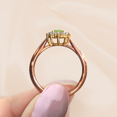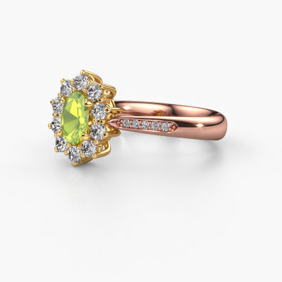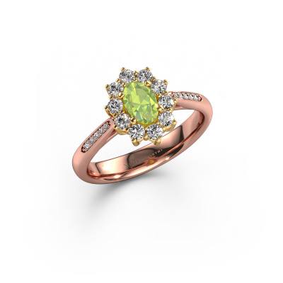La bague de fiançailles présentée ci-dessus a été nommée Leesa 2. Nous appelons ce type de bague de fiançailles une bague entourage, dans laquelle de petites pierres précieuses sont serties autour de la pierre centrale dans un sertissage ouvert. Cette bague de fiançailles forgée en or 14 Carat a un péridot ovale de 6x4 mm en guise de pierre centrale qui est aussi entourée de petits diamants. La particularité de cette bague de fiançailles classiques forgée en or rose est sa forme : les petites pierres précieuses et le péridot forment une belle fleur qui semble se fondre en une large pierre précieuse étincelante. Cette bague de fiançailles est aussi appelée la bague de fiançailles fleur ou rosette. Nos maîtres orfèvres veillent à ce que les plus petits diamants soient tous sertis de la même manière, afin que la lumière passant au travers du péridot ne soit pas interrompue et qu'une belle unité soit créée. Avec un œil expérimenté et une main habile, chaque péridot soigneusement sélectionné est serti dans la bague de fiançailles. Toujours et encore, la bague de fiançailles est examinée sous la lumière pour voir si l'effet spécial désiré est encore visible. Le résultat est une bague de fiançailles unique, où le péridot choisi devient littéralement le centre brillants. Quelle bague de fiançailles belle et significative à offrir au centre qui brille dans votre vie ! Vous avez peut-être remarqué que nos prix sont en moyenne inférieurs de 30% à ceux d'un autre bijoutier. Et ce alors que la qualité de nos bijoux est même plus élevée dans la plupart des cas ! En effet, nos orfèvres fabriquent votre bague de fiançailles directement dans notre propre atelier. Cela signifie que nous n'avons pas à inclure des frais de stocks coûteux et que nous pouvons travailler n'importe quel détail directement sur votre bague de fiançailles.Notre équipe de designers talentueux et passionnés ajoute chaque jour de nouveaux modèles bague de fiançailles à notre collection en ligne. Notre objectif est de pouvoir vous offrir une grande variété de bijoux. N'hésitez pas à demander un devis si vous avez des souhaits spécifiques pour votre bague de fiançailles. Nous garantissons de vous faire une offre que vous ne pourrez pas refuser.Pour vous faciliter la tâche, vous pouvez facilement nous retourner tout bijou commandé dans les 30 jours suivant la livraison.