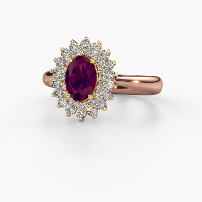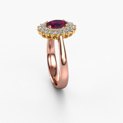 La bague de fiançailles présentée ci-dessus a été nommée Alina 1. Nous appelons ce type de bague de fiançailles une bague entourage, dans laquelle de petites pierres précieuses sont serties autour de la pierre centrale dans un sertissage ouvert. Cette bague de fiançailles forgée en or 14 Carat a un rhodolite ovale de 7x5 mm en guise de pierre centrale qui est aussi entourée de petits diamants. La particularité de cette bague de fiançailles classiques forgée en or rose est sa forme : les petites pierres précieuses et le rhodolite forment une belle fleur qui semble se fondre en une large pierre précieuse étincelante. Cette bague de fiançailles est aussi appelée la bague de fiançailles fleur ou rosette. Nos maîtres orfèvres veillent à ce que les plus petits diamants soient tous sertis de la même manière, afin que la lumière passant au travers du rhodolite ne soit pas interrompue et qu'une belle unité soit créée. Avec un œil expérimenté et une main habile, chaque rhodolite soigneusement sélectionné est serti dans la bague de fiançailles. Toujours et encore, la bague de fiançailles est examinée sous la lumière pour voir si l'effet spécial désiré est encore visible. Le résultat est une bague de fiançailles unique, où le rhodolite choisi devient littéralement le centre brillants. Quelle bague de fiançailles belle et significative à offrir au centre qui brille dans votre vie ! Vous avez peut-être remarqué que nos prix sont en moyenne inférieurs de 30% à ceux d'un autre bijoutier. Et ce alors que la qualité de nos bijoux est même plus élevée dans la plupart des cas ! En effet, nos orfèvres fabriquent votre bague de fiançailles directement dans notre propre atelier. Cela signifie que nous n'avons pas à inclure des frais de stocks coûteux et que nous pouvons travailler n'importe quel détail directement sur votre bague de fiançailles.Notre équipe de designers talentueux et passionnés ajoute chaque jour de nouveaux modèles bague de fiançailles à notre collection en ligne. Notre objectif est de pouvoir vous offrir une grande variété de bijoux. N'hésitez pas à demander un devis si vous avez des souhaits spécifiques pour votre bague de fiançailles. Nous garantissons de vous faire une offre que vous ne pourrez pas refuser.Pour vous faciliter la tâche, vous pouvez facilement nous retourner tout bijou commandé dans les 30 jours suivant la livraison.