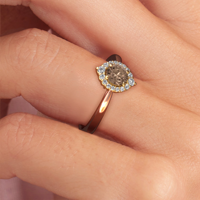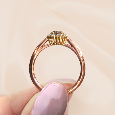 La bague de fiançailles présentée ci-dessus a été nommée Tora. Nous appelons ce type de bague de fiançailles une bague entourage, dans laquelle de petites pierres précieuses sont serties autour de la pierre centrale dans un sertissage ouvert. Cette bague de fiançailles forgée en or 14 Carat a un diamant brun ronds de 0.50 crt en guise de pierre centrale qui est aussi entourée de petits diamants synthétiques. La particularité de cette bague de fiançailles classiques forgée en or rose est sa forme : les petites pierres précieuses et le diamant brun forment une belle fleur qui semble se fondre en une large pierre précieuse étincelante. Cette bague de fiançailles est aussi appelée la bague de fiançailles fleur ou rosette. Nos maîtres orfèvres veillent à ce que les plus petits diamants synthétiques soient tous sertis de la même manière, afin que la lumière passant au travers du diamant brun ne soit pas interrompue et qu'une belle unité soit créée. Avec un œil expérimenté et une main habile, chaque diamant brun soigneusement sélectionné est serti dans la bague de fiançailles. Toujours et encore, la bague de fiançailles est examinée sous la lumière pour voir si l'effet spécial désiré est encore visible. Le résultat est une bague de fiançailles unique, où le diamant brun choisi devient littéralement le centre brillants. Quelle bague de fiançailles belle et significative à offrir au centre qui brille dans votre vie ! En combinant les dernières techniques modernes, associées à une fabrication ancienne, nous sommes en mesure de fabriquer nos bagues de fiançailles dans notre propre studio. Chaque bijou est fabriqué sur commande. Ceci est avantageux car nous sommes en mesure de vous proposer un prix que vous ne trouverez nulle part ailleurs.Avez-vous déjà des bague de fiançailles spécifiques en tête ? Une bague de fiançailles que vous avez vu quelque part. N'hésitez pas à nous faire part de vos souhaits et nous transformerons votre design en des bague de fiançailles uniques. Vous êtes en mesure de suivre l'évolution de la conception de vos bague de fiançailles car nous utilisons des dessins en 3D. Cela vous donnera un aperçu réaliste de votre design. Nous vous enverrons volontiers une offre sans engagement basée sur un rapport qualité / prix juste. Elle va vous étonner.Pour vous faciliter la tâche, vous pouvez facilement nous retourner tout bijou commandé dans les 30 jours suivant la livraison.