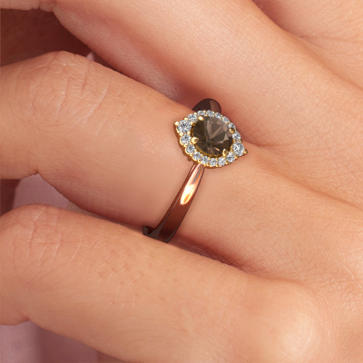La bague de fiançailles présentée ci-dessus a été nommée Tora. Nous appelons ce type de bague de fiançailles une bague entourage, dans laquelle de petites pierres précieuses sont serties autour de la pierre centrale dans un sertissage ouvert. Cette bague de fiançailles forgée en or 14 Carat a un quartz fumé ronds de 5 mm en guise de pierre centrale qui est aussi entourée de petits diamants synthétiques. La particularité de cette bague de fiançailles classiques forgée en or rose est sa forme : les petites pierres précieuses et le quartz fumé forment une belle fleur qui semble se fondre en une large pierre précieuse étincelante. Cette bague de fiançailles est aussi appelée la bague de fiançailles fleur ou rosette. Nos maîtres orfèvres veillent à ce que les plus petits diamants synthétiques soient tous sertis de la même manière, afin que la lumière passant au travers du quartz fumé ne soit pas interrompue et qu'une belle unité soit créée. Avec un œil expérimenté et une main habile, chaque quartz fumé soigneusement sélectionné est serti dans la bague de fiançailles. Toujours et encore, la bague de fiançailles est examinée sous la lumière pour voir si l'effet spécial désiré est encore visible. Le résultat est une bague de fiançailles unique, où le quartz fumé choisi devient littéralement le centre brillants. Quelle bague de fiançailles belle et significative à offrir au centre qui brille dans votre vie ! En combinant les dernières techniques modernes, associées à une fabrication ancienne, nous sommes en mesure de fabriquer nos bagues de fiançailles dans notre propre studio. Chaque bijou est fabriqué sur commande. Ceci est avantageux car nous sommes en mesure de vous proposer un prix que vous ne trouverez nulle part ailleurs.Avez-vous déjà des bague de fiançailles spécifiques en tête ? Une bague de fiançailles que vous avez vu quelque part. N'hésitez pas à nous faire part de vos souhaits et nous transformerons votre design en des bague de fiançailles uniques. Vous êtes en mesure de suivre l'évolution de la conception de vos bague de fiançailles car nous utilisons des dessins en 3D. Cela vous donnera un aperçu réaliste de votre design. Nous vous enverrons volontiers une offre sans engagement basée sur un rapport qualité / prix juste. Elle va vous étonner.Pour vous faciliter la tâche, vous pouvez facilement nous retourner tout bijou commandé dans les 30 jours suivant la livraison.