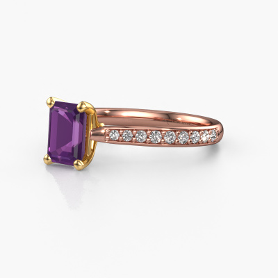 La bague de fiançailles mentionnée ci-dessus a été nommée Mignon eme 2. Ce type de bague de fiançailles est appelé une bague de fiançailles solitaire pavé car elle ne comporte qu’une seule pierre centrale et les tiges de la bague de fiançailles sont également pleins. La bague de fiançailles est faite dans une combinaison d'or 14 Carat et d’or jaune et a un améthyste taille émeraude d’une de 7x5 mm, et des diamants synthétiques sont sertis sur les épaules de l’anneau. Chaque bijou est faite spécialement pour vous, avec une attention particulière portée aux détails et au design. Cette bague de fiançailles solitaire pavé forgée en or rose exclusives a un beau améthystes taille émeraude comme pierre centrale, avec plus de améthystes sertis dans la bague pour accentuer encore plus la présence de la pierre centrale. Le sertissage à griffes autour du améthyste étant ouvert, le améthyste capte la lumière de tous les côtés et brille de manière optimale. Ci-dessus, vous pouvez voir comment notre orfèvre travaille la bague de fiançailles avec une extrême précision dans les moindres détails, de telle sorte que le améthyste élevé puisse attirer tous les regards. Quelle belle bague de fiançailles à offrir lors de votre demande en mariage à l'amour de votre vie, à votre centre rayonnant ! Vous avez peut-être remarqué que nos prix sont en moyenne inférieurs de 30% à ceux d'un autre bijoutier. Et ce alors que la qualité de nos bijoux est même plus élevée dans la plupart des cas ! En effet, nos orfèvres fabriquent votre bague de fiançailles directement dans notre propre atelier. Cela signifie que nous n'avons pas à inclure des frais de stocks coûteux et que nous pouvons travailler n'importe quel détail directement sur votre bague de fiançailles.Avez-vous déjà des bague de fiançailles spécifiques en tête ? Une bague de fiançailles que vous avez vu quelque part. N'hésitez pas à nous faire part de vos souhaits et nous transformerons votre design en des bague de fiançailles uniques. Vous êtes en mesure de suivre l'évolution de la conception de vos bague de fiançailles car nous utilisons des dessins en 3D. Cela vous donnera un aperçu réaliste de votre design. Nous vous enverrons volontiers une offre sans engagement basée sur un rapport qualité / prix juste. Elle va vous étonner.Pour vous faciliter la tâche, vous pouvez facilement nous retourner tout bijou commandé dans les 30 jours suivant la livraison.