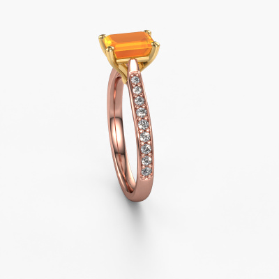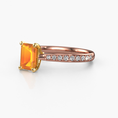 La bague de fiançailles mentionnée ci-dessus a été nommée Mignon eme 2. Ce type de bague de fiançailles est appelé une bague de fiançailles solitaire pavé car elle ne comporte qu’une seule pierre centrale et les tiges de la bague de fiançailles sont également pleins. La bague de fiançailles est faite dans une combinaison d'or 14 Carat et d’or jaune et a un citrine taille émeraude d’une de 7x5 mm, et des diamants synthétiques sont sertis sur les épaules de l’anneau. Chaque bijou est faite spécialement pour vous, avec une attention particulière portée aux détails et au design. Cette bague de fiançailles solitaire pavé forgée en or rose exclusives a un beau citrines taille émeraude comme pierre centrale, avec plus de citrines sertis dans la bague pour accentuer encore plus la présence de la pierre centrale. Le sertissage à griffes autour du citrine étant ouvert, le citrine capte la lumière de tous les côtés et brille de manière optimale. Ci-dessus, vous pouvez voir comment notre orfèvre travaille la bague de fiançailles avec une extrême précision dans les moindres détails, de telle sorte que le citrine élevé puisse attirer tous les regards. Quelle belle bague de fiançailles à offrir lors de votre demande en mariage à l'amour de votre vie, à votre centre rayonnant ! Vous avez peut-être remarqué que nos prix sont en moyenne inférieurs de 30% à ceux d'un autre bijoutier. Et ce alors que la qualité de nos bijoux est même plus élevée dans la plupart des cas ! En effet, nos orfèvres fabriquent votre bague de fiançailles directement dans notre propre atelier. Cela signifie que nous n'avons pas à inclure des frais de stocks coûteux et que nous pouvons travailler n'importe quel détail directement sur votre bague de fiançailles.Avez-vous déjà des bague de fiançailles spécifiques en tête ? Une bague de fiançailles que vous avez vu quelque part. N'hésitez pas à nous faire part de vos souhaits et nous transformerons votre design en des bague de fiançailles uniques. Vous êtes en mesure de suivre l'évolution de la conception de vos bague de fiançailles car nous utilisons des dessins en 3D. Cela vous donnera un aperçu réaliste de votre design. Nous vous enverrons volontiers une offre sans engagement basée sur un rapport qualité / prix juste. Elle va vous étonner.Pour vous faciliter la tâche, vous pouvez facilement nous retourner tout bijou commandé dans les 30 jours suivant la livraison.