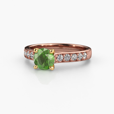 La bague de fiançailles mentionnée ci-dessus a été nommée Valorie RND 2. Ce type de bague de fiançailles est appelé une bague de fiançailles solitaire pavé car elle ne comporte qu’une seule pierre centrale et les tiges de la bague de fiançailles sont également pleins. La bague de fiançailles est faite dans une combinaison d'or 14 Carat et d’or jaune et a un vert tourmaline ronds d’une de 6.5 mm, et des diamants synthétiques sont sertis sur les épaules de l’anneau. Chaque bijou est faite spécialement pour vous, avec une attention particulière portée aux détails et au design. Cette bague de fiançailles solitaire pavé forgée en or rose modernes a un beau vert tourmaline ronds comme pierre centrale, avec plus de vert tourmaline sertis dans la bague pour accentuer encore plus la présence de la pierre centrale. Le sertissage à griffes autour du vert tourmaline étant ouvert, le vert tourmaline capte la lumière de tous les côtés et brille de manière optimale. Ci-dessus, vous pouvez voir comment notre orfèvre travaille la bague de fiançailles avec une extrême précision dans les moindres détails, de telle sorte que le vert tourmaline élevé puisse attirer tous les regards. Quelle belle bague de fiançailles à offrir lors de votre demande en mariage à l'amour de votre vie, à votre centre rayonnant ! Qu'y a-t-il dorénavant de plus beau qu'une bague de fiançailles modernes conçue par vous-même et fabriquée à la main par nous. Vous pouvez personnaliser chaque modèle avec les différents métaux précieux et pierres précieuses. De cette façon, vous pourrez créer une bague de fiançailles unique. Cette bague peut être mise en place de plusieurs façons. Bien sûr, vous pouvez toujours nous contacter et nous serons heureux de vous aider à composer votre bague de fiançailles modernes Valorie RND 2. Vous aimez le design, mais vous souhaitez tout de même quelque chose qui vous convienne plus, ou bien vous souhaitez une pierre précieuse dans les bijoux que vous ne pouvez pas choisir sur notre site, contactez-nous et nous vous aiderons.Notre équipe de designers talentueux et passionnés ajoute chaque jour de nouveaux modèles bague de fiançailles à notre collection en ligne. Notre objectif est de pouvoir vous offrir une grande variété de bijoux. N'hésitez pas à demander un devis si vous avez des souhaits spécifiques pour votre bague de fiançailles. Nous garantissons de vous faire une offre que vous ne pourrez pas refuser.Pour vous faciliter la tâche, vous pouvez facilement nous retourner tout bijou commandé dans les 30 jours suivant la livraison.