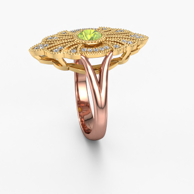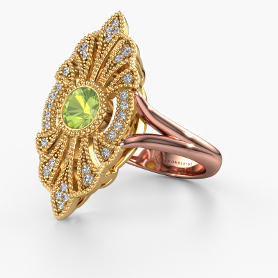 Cette bague de fiançailles porte le nom Hanna. Cette bague de fiançailles forgée en or 14 Carat est sertie d’un péridot de 5 mm. Cette bague de fiançailles forgée en or rose en filigrane est un chef-d’œuvre en soi. Un magnifique design de fils sophistiqués qui forment un ensemble unique. Et simultanément, un beau défi pour nos orfèvres passionnés ! Avec un grand dévouement, de la patience et une grande précision, ils forgent cette bague de fiançailles spécialement pour votre bien-aimée. Tout est fabriqué à la main, de telle sorte que chaque fil puisse être parfaitement travaillé dans les moindres détails. Un long processus de forgeage, de travail et de polissage, jusqu'à ce que le maître forgeron, gardant la bague de fiançailles à la lumière, soit satisfait du résultat... Une bague de fiançailles parfaite dont il est vraiment fier. C'est la raison pour laquelle cette bague de fiançailles en filigrane vintage est aussi une large bague de fiançailles à offrir à l'amour de votre vie ! Vous allez bientôt faire votre demande à cette personne, et cette bague de fiançailles unique n’est faite que pour cette seule personne ! Merveilleux, non ? Ce bijou est faite pour briller sur votre doigt, chaque bijou est fabriqué à la main par nos orfèvres.Saviez-vous que nous offrons la garantie du meilleur prix pour votre bague de fiançailles? Cela est possible car tous nos bijoux sont fabriqués à la main dans notre propre atelier. Nous n'avons pas de frais de stocks qui sont coûteux, et nous fabriquons votre bague uniquement une fois que vous l'avez commandée. Grâce au fait que nous ayons toute la production du bijou en main, nous pouvons vous informer sur toutes les caractéristiques de cette bague de fiançailles. C’est précisément parce que l’achat d’une bague en ligne est une expérience excitante que nous comprenons qu’il est plus confortable pour vous de connaître toutes les caractéristiques de votre bague.Notre équipe ajoute quotidiennement de nouveaux modèles à notre collection en ligne. Nos designers et orfèvres travaillent ensemble pour créer le meilleur design. Nous nous efforçons d'offrir une collection diversifiée de bijoux. Peut-être avez-vous déjà en tête un bijou en particulier ? Un bijou que vous avez trouvé quelque part. Veuillez nous contacter pour une consultation gratuite. Nous vous ferons une offre, basée sur un rapport qualité / prix juste, qui vous déconcertera.Pour vous faciliter la tâche, vous pouvez facilement nous retourner tout bijou commandé dans les 30 jours suivant la livraison.