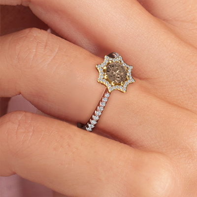 Cette bague de fiançailles porte le nom Zena. Cette bague de fiançailles forgée en or 14 Carat est sertie d’un diamant brun. Cette bague de fiançailles unique est une large bague vintage forgée en or rose qui laissera certainement briller