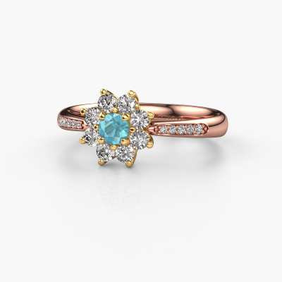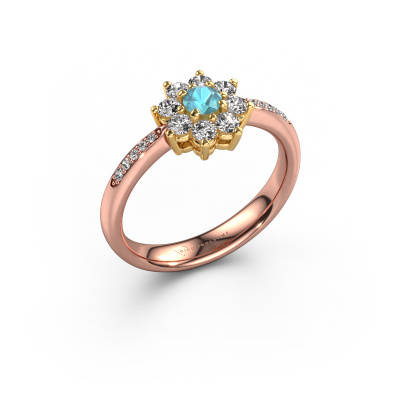 La bague de fiançailles présentée ci-dessus a été nommée Camille 2. Nous appelons ce type de bague de fiançailles une bague flower, dans laquelle de petites pierres précieuses sont serties autour de la pierre centrale dans un sertissage ouvert. Cette bague de fiançailles forgée en or 14 Carat a un topaze bleue ronds de 3.4 mm en guise de pierre centrale qui est aussi entourée de petits diamants. Si vous regardez cette bague de fiançailles flower forgée en or rose, vous avez l'impression que les plus petites pierres précieuses, ainsi que le grand topaze bleue, fusionnent en une seule grosse pierre scintillante, sous la forme d’une belle fleur. Cette bague de fiançailles peut aussi avoir un autre nom tel que bague fleur ou la bague rosette. Cependant, les diamants plus petits doivent tous être sertis de la même manière, afin que la lumière passant au travers du topaze bleue ne soit pas interrompue et qu'une véritable unité soit créée. Voici donc le travail de nos maîtres orfèvres. Avec la plus grande précision, chaque topaze bleue soigneusement sélectionné est serti à la main dans la bague de fiançailles. Toujours et encore, la bague de fiançailles est surveillée de près sous la lumière pour voir si l'effet spécial désiré est toujours visible. Puisque nous concevons et livrons nos propres bijoux, nous sommes en mesure de vous proposer une bague de fiançailles à un prix que vous ne pourrez pas trouver ailleurs. Une alliance est fabriquée sur commande, ce qui permet d'éviter les excédents de matériel et nous permet de vous proposer une superbe offre de prix. Nous comprenons qu'acheter votre bague de fiançailles en ligne soit un risque, mais nous vous assistons volontiers dans le processus de conception, en tenant compte de votre budget.Notre équipe ajoute quotidiennement de nouveaux modèles à notre collection en ligne. Nos designers et orfèvres travaillent ensemble pour créer le meilleur design. Nous nous efforçons d'offrir une collection diversifiée de bijoux. Peut-être avez-vous déjà en tête un bijou en particulier ? Un bijou que vous avez trouvé quelque part. Veuillez nous contacter pour une consultation gratuite. Nous vous ferons une offre, basée sur un rapport qualité / prix juste, qui vous déconcertera.Pour vous faciliter la tâche, vous pouvez facilement nous retourner tout bijou commandé dans les 30 jours suivant la livraison.