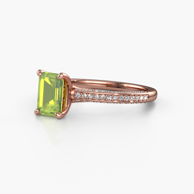 Nous avons donné le nom Elenore eme à la bague de fiançailles mentionnée ci-dessous. Ce type de bague de fiançailles est appelé une bague de fiançailles solitaire pavé car elle ne comporte qu’une seule pierre centrale et les tiges de la bague de fiançailles ont également une finition pleine. Cette bague de fiançailles est forgée en or 14 Carat et comporte un péridot taille émeraude de 7x5 mm. Des diamants synthétiques sont sertis dans les épaules latérales de l’anneau. Chaque bijou est faite spécialement pour vous, avec une attention particulière portée aux détails et au design.. Cette bague de fiançailles solitaire pavé forgée en or rose exclusives a un beau péridot taille émeraude en guise de pierre centrale, avec plus de diamants synthétiques dans l’anneau pour accentuer encore plus l’effet de la pierre centrale. Le sertissage à griffes autour du péridot étant ouvert, le péridot capte la lumière de tous les côtés et brille de manière optimale. Ci-dessus, vous pouvez voir comment notre orfèvre a travaillé la bague de fiançailles dans les moindres détails. de telle sorte que le péridot élevé puisse véritablement attirer tous les regards. Quelle belle bague de fiançailles à offre lors de votre demande en mariage à l'amour de votre vie, à votre centre rayonnant ! Vous avez peut-être remarqué que nos prix sont en moyenne inférieurs de 30% à ceux d'un autre bijoutier. Et ce alors que la qualité de nos bijoux est même plus élevée dans la plupart des cas ! En effet, nos orfèvres fabriquent votre bague de fiançailles directement dans notre propre atelier. Cela signifie que nous n'avons pas à inclure des frais de stocks coûteux et que nous pouvons travailler n'importe quel détail directement sur votre bague de fiançailles.Avez-vous déjà des bague de fiançailles spécifiques en tête ? Une bague de fiançailles que vous avez vu quelque part. N'hésitez pas à nous faire part de vos souhaits et nous transformerons votre design en des bague de fiançailles uniques. Vous êtes en mesure de suivre l'évolution de la conception de vos bague de fiançailles car nous utilisons des dessins en 3D. Cela vous donnera un aperçu réaliste de votre design. Nous vous enverrons volontiers une offre sans engagement basée sur un rapport qualité / prix juste. Elle va vous étonner.Pour vous faciliter la tâche, vous pouvez facilement nous retourner tout bijou commandé dans les 30 jours suivant la livraison.