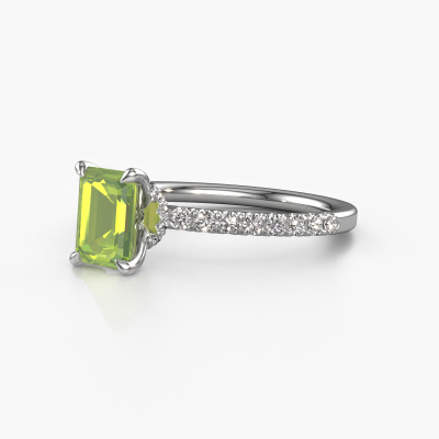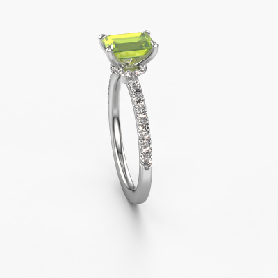 La bague de fiançailles mentionnée ci-dessus a été nommée Crystal EME 4. Ce type de bague de fiançailles est appelé une bague de fiançailles solitaire pavé car elle ne comporte qu’une seule pierre centrale et les tiges de la bague de fiançailles sont également pleins. La bague de fiançailles est faite dans une combinaison d'or et d’platine et a un péridot taille émeraude d’une de 7x5 mm, et des diamants synthétiques sont sertis sur les épaules de l’anneau. Chaque bijou est faite pour briller sur votre doigt, chaque bijou est fabriqué à la main par nos orfèvres. Cette bague de fiançailles solitaire pavé forgée en platine à la mode a un beau péridots taille émeraude comme pierre centrale, avec plus de péridots sertis dans la bague pour accentuer encore plus la présence de la pierre centrale. Le sertissage à griffes autour du péridot étant ouvert, le péridot capte la lumière de tous les côtés et brille de manière optimale. Ci-dessus, vous pouvez voir comment notre orfèvre travaille la bague de fiançailles avec une extrême précision dans les moindres détails, de telle sorte que le péridot élevé puisse attirer tous les regards. Quelle belle bague de fiançailles à offrir lors de votre demande en mariage à l'amour de votre vie, à votre centre rayonnant ! Saviez-vous que nous offrons la garantie du meilleur prix pour votre bague de fiançailles? Cela est possible car tous nos bijoux sont fabriqués à la main dans notre propre atelier. Nous n'avons pas de frais de stocks qui sont coûteux, et nous fabriquons votre bague uniquement une fois que vous l'avez commandée. Grâce au fait que nous ayons toute la production du bijou en main, nous pouvons vous informer sur toutes les caractéristiques de cette bague de fiançailles. C’est précisément parce que l’achat d’une bague en ligne est une expérience excitante que nous comprenons qu’il est plus confortable pour vous de connaître toutes les caractéristiques de votre bague.Notre équipe ajoute quotidiennement de nouveaux modèles à notre collection en ligne. Nos designers et orfèvres travaillent ensemble pour créer le meilleur design. Nous nous efforçons d'offrir une collection diversifiée de bijoux. Peut-être avez-vous déjà en tête un bijou en particulier ? Un bijou que vous avez trouvé quelque part. Veuillez nous contacter pour une consultation gratuite. Nous vous ferons une offre, basée sur un rapport qualité / prix juste, qui vous déconcertera.Pour vous faciliter la tâche, vous pouvez facilement nous retourner tout bijou commandé dans les 30 jours suivant la livraison.