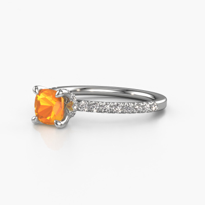 La bague de fiançailles mentionnée ci-dessus a été nommée Crystal CUS 4. Ce type de bague de fiançailles est appelé une bague de fiançailles solitaire pavé car elle ne comporte qu’une seule pierre centrale et les tiges de la bague de fiançailles sont également pleins. La bague de fiançailles est faite dans une combinaison d'or et d’platine et a un citrine coussin d’une de 5.5 mm, et des diamants sont sertis sur les épaules de l’anneau. Chaque bijou est faite pour briller sur votre doigt, chaque bijou est fabriqué à la main par nos orfèvres. Cette bague de fiançailles solitaire pavé forgée en platine élégants a un beau citrines coussin comme pierre centrale, avec plus de citrines sertis dans la bague pour accentuer encore plus la présence de la pierre centrale. Le sertissage à griffes autour du citrine étant ouvert, le citrine capte la lumière de tous les côtés et brille de manière optimale. Ci-dessus, vous pouvez voir comment notre orfèvre travaille la bague de fiançailles avec une extrême précision dans les moindres détails, de telle sorte que le citrine élevé puisse attirer tous les regards. Quelle belle bague de fiançailles à offrir lors de votre demande en mariage à l'amour de votre vie, à votre centre rayonnant ! Qu'y a-t-il dorénavant de plus beau qu'une bague de fiançailles élégants conçue par vous-même et fabriquée à la main par nous. Vous pouvez personnaliser chaque modèle avec les différents métaux précieux et pierres précieuses. De cette façon, vous pourrez créer une bague de fiançailles unique. Cette bague peut être mise en place de plusieurs façons. Bien sûr, vous pouvez toujours nous contacter et nous serons heureux de vous aider à composer votre bague de fiançailles élégants Crystal CUS 4. Vous aimez le design, mais vous souhaitez tout de même quelque chose qui vous convienne plus, ou bien vous souhaitez une pierre précieuse dans les bijoux que vous ne pouvez pas choisir sur notre site, contactez-nous et nous vous aiderons.Avez-vous déjà des bague de fiançailles spécifiques en tête ? Une bague de fiançailles que vous avez vu quelque part. N'hésitez pas à nous faire part de vos souhaits et nous transformerons votre design en des bague de fiançailles uniques. Vous êtes en mesure de suivre l'évolution de la conception de vos bague de fiançailles car nous utilisons des dessins en 3D. Cela vous donnera un aperçu réaliste de votre design. Nous vous enverrons volontiers une offre sans engagement basée sur un rapport qualité / prix juste. Elle va vous étonner.Pour vous faciliter la tâche, vous pouvez facilement nous retourner tout bijou commandé dans les 30 jours suivant la livraison.
