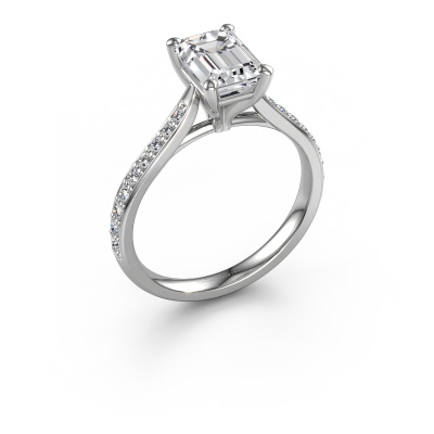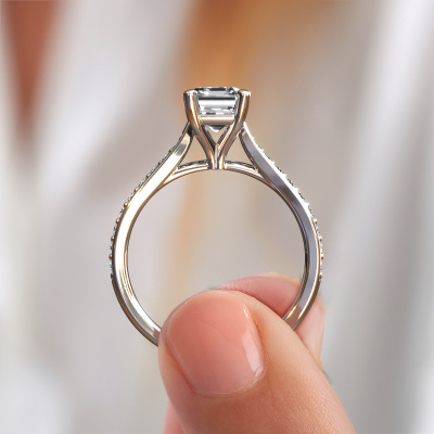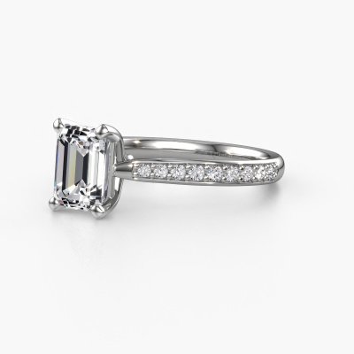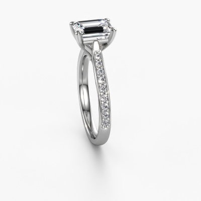 La bague de fiançailles mentionnée ci-dessus a été nommée Mignon EME 2. Ce type de bague de fiançailles est appelé une bague de fiançailles solitaire pavé car elle ne comporte qu’une seule pierre centrale et les tiges de la bague de fiançailles sont également pleins. La bague de fiançailles est faite dans une combinaison d'or et d’platine et a un diamant taille émeraude d’une de 1.50 crt, et des diamants synthétiques sont sertis sur les épaules de l’anneau. Chaque bijou est faite spécialement pour vous, avec une attention particulière portée aux détails et au design. Cette bague de fiançailles solitaire pavé forgée en platine exclusives a un beau diamants taille émeraude comme pierre centrale, avec plus de diamants sertis dans la bague pour accentuer encore plus la présence de la pierre centrale. Le sertissage à griffes autour du diamant étant ouvert, le diamant capte la lumière de tous les côtés et brille de manière optimale. Ci-dessus, vous pouvez voir comment notre orfèvre travaille la bague de fiançailles avec une extrême précision dans les moindres détails, de telle sorte que le diamant élevé puisse attirer tous les regards. Quelle belle bague de fiançailles à offrir lors de votre demande en mariage à l'amour de votre vie, à votre centre rayonnant ! Vous avez peut-être remarqué que nos prix sont en moyenne inférieurs de 30% à ceux d'un autre bijoutier. Et ce alors que la qualité de nos bijoux est même plus élevée dans la plupart des cas ! En effet, nos orfèvres fabriquent votre bague de fiançailles directement dans notre propre atelier. Cela signifie que nous n'avons pas à inclure des frais de stocks coûteux et que nous pouvons travailler n'importe quel détail directement sur votre bague de fiançailles.Avez-vous déjà des bague de fiançailles spécifiques en tête ? Une bague de fiançailles que vous avez vu quelque part. N'hésitez pas à nous faire part de vos souhaits et nous transformerons votre design en des bague de fiançailles uniques. Vous êtes en mesure de suivre l'évolution de la conception de vos bague de fiançailles car nous utilisons des dessins en 3D. Cela vous donnera un aperçu réaliste de votre design. Nous vous enverrons volontiers une offre sans engagement basée sur un rapport qualité / prix juste. Elle va vous étonner.Pour vous faciliter la tâche, vous pouvez facilement nous retourner tout bijou commandé dans les 30 jours suivant la livraison.