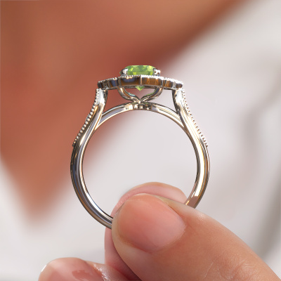 Cette bague de fiançailles porte le nom Rosan. Cette bague de fiançailles forgée en or est sertie d’un péridot. Cette bague de fiançailles unique est une large bague vintage forgée en platine qui laissera certainement briller l’amour de votre vie ! Et c'est exactement ce que nous avons comme objectif. De magnifiques péridots ont été sertis sur cette bague de fiançailles vintage. Vous pouvez, bien entendu, utiliser chaque pierre précieuse que nous proposons sur notre site. La pierre précieuse sera sélectionnée avec soin, car nous pensons que seule la plus belle des pierres précieuses peut briller sur votre bague de fiançailles, qu’en dites-vous ? Notre orfèvre fabrique votre bague de fiançailles dans notre propre atelier et place le péridot dans son anneau avec une précision extrême. Puis, elle est travaillée et polie jusqu'à ce que le résultat soit visible : la bague de fiançailles parfaite pour l'amour de votre vie ! Ce bijou est fabriquées spécialement pour vous par nos maîtres orfèvres dans notre propre atelier.Saviez-vous que nous offrons la garantie du meilleur prix pour votre bague de fiançailles? Cela est possible car tous nos bijoux sont fabriqués à la main dans notre propre atelier. Nous n'avons pas de frais de stocks qui sont coûteux, et nous fabriquons votre bague uniquement une fois que vous l'avez commandée. Grâce au fait que nous ayons toute la production du bijou en main, nous pouvons vous informer sur toutes les caractéristiques de cette bague de fiançailles. C’est précisément parce que l’achat d’une bague en ligne est une expérience excitante que nous comprenons qu’il est plus confortable pour vous de connaître toutes les caractéristiques de votre bague.Notre équipe ajoute quotidiennement de nouveaux modèles à notre collection en ligne. Nos designers et orfèvres travaillent ensemble pour créer le meilleur design. Nous nous efforçons d'offrir une collection diversifiée de bijoux. Peut-être avez-vous déjà en tête un bijou en particulier ? Un bijou que vous avez trouvé quelque part. Veuillez nous contacter pour une consultation gratuite. Nous vous ferons une offre, basée sur un rapport qualité / prix juste, qui vous déconcertera.Pour vous faciliter la tâche, vous pouvez facilement nous retourner tout bijou commandé dans les 30 jours suivant la livraison.