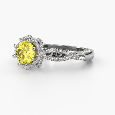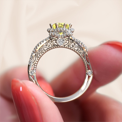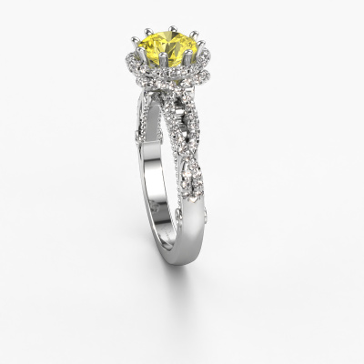 Cette bague de fiançailles porte le nom Lysanne. Cette bague de fiançailles forgée en or est sertie d’un diamants synthétiques jaune de 6.5 mm. Cette bague de fiançailles forgée en platine en filigrane est un chef-d’œuvre en soi. Un magnifique design de fils sophistiqués qui forment un ensemble unique. Et simultanément, un beau défi pour nos orfèvres passionnés ! Avec un grand dévouement, de la patience et une grande précision, ils forgent cette bague de fiançailles spécialement pour votre bien-aimée. Tout est fabriqué à la main, de telle sorte que chaque fil puisse être parfaitement travaillé dans les moindres détails. Un long processus de forgeage, de travail et de polissage, jusqu'à ce que le maître forgeron, gardant la bague de fiançailles à la lumière, soit satisfait du résultat... Une bague de fiançailles parfaite dont il est vraiment fier. C'est la raison pour laquelle cette bague de fiançailles en filigrane vintage est aussi une large bague de fiançailles à offrir à l'amour de votre vie ! Vous allez bientôt faire votre demande à cette personne, et cette bague de fiançailles unique n’est faite que pour cette seule personne ! Merveilleux, non ? Ce bijou est fabriquée par une équipe d'orfèvres et de designers motivés. Cela permettra à cette pièce unique d'attirer tous les regards.Nos orfèvres ne fabriqueront votre bague de fiançailles qu'une fois que vous l'aurez commandée. Nous ne faisons pas de stock. L'avantage de cela est que nous n'avons pas à inclure les frais de stockage dans nos prix, et nous pouvons donc vous offrir des bijoux à un prix très bas.Avez-vous déjà des bague de fiançailles spécifiques en tête ? Une bague de fiançailles que vous avez vu quelque part. N'hésitez pas à nous faire part de vos souhaits et nous transformerons votre design en des bague de fiançailles uniques. Vous êtes en mesure de suivre l'évolution de la conception de vos bague de fiançailles car nous utilisons des dessins en 3D. Cela vous donnera un aperçu réaliste de votre design. Nous vous enverrons volontiers une offre sans engagement basée sur un rapport qualité / prix juste. Elle va vous étonner.Pour vous faciliter la tâche, vous pouvez facilement nous retourner tout bijou commandé dans les 30 jours suivant la livraison.
