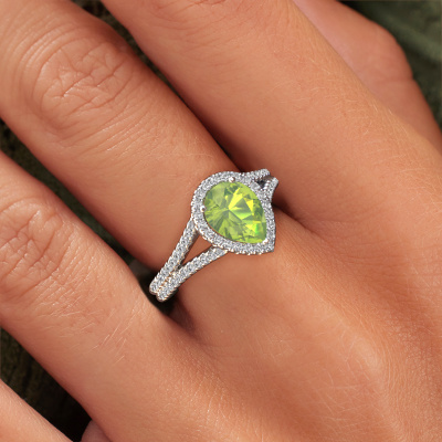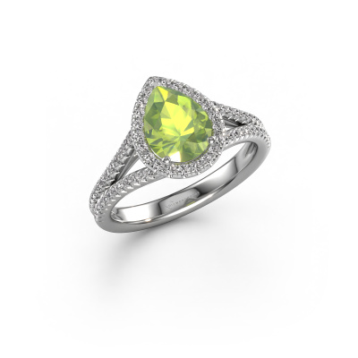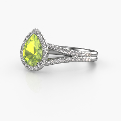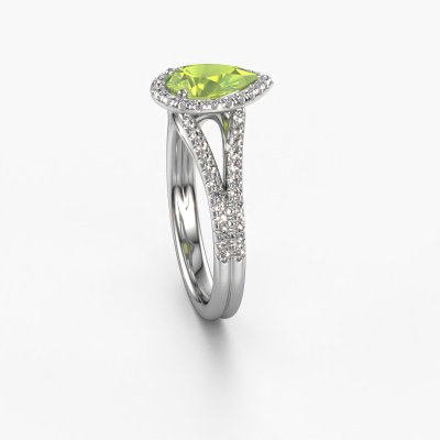 La bague de fiançailles mentionnée ci-dessus est nommée Verla pear 2. Nous appelons ce type de bague de fiançailles une bague Halo. La bague de fiançailles est forgée en or et comporte un péridot poire de la de 8x6 mm et autour duquel sont sertis de petits diamants. La largeur de cette bague de fiançailles halo forgée en platine exclusives vient des plus petites pierres précieuses qui sont serties autour du large péridot central. C’est également ce à partir de quoi cette belle bague de fiançailles tire son nom : halo signifie halo et c’est aussi l’effet que rendent les pierres précieuses plus petites. Cependant, ces pierres précieuses plus petites doivent toutes être serties de la même manière, afin que la lumière ne soit pas seulement introduite dans le péridot et qu’un véritable halo de lumière soit créé. Et c'est ce que font nos maîtres orfèvres. Avec la plus grande précision, chaque péridot soigneusement sélectionné est placé à la main dans la bague de fiançailles. Encore et encore, la bague de fiançailles est maintenue à la lumière pour voir si l'effet spécial est toujours visible. Le résultat est une bague de fiançailles unique, où le péridot choisi devient littéralement le centre brillants. Vous pouvez imaginer que cette bague de fiançailles est vraiment une bague de fiançailles significative à offrir à votre amour de la vie ! Le jour où vous montrez qu’elle est votre centre brillants ! Saviez-vous que nous offrons la garantie du meilleur prix pour votre bague de fiançailles? Cela est possible car tous nos bijoux sont fabriqués à la main dans notre propre atelier. Nous n'avons pas de frais de stocks qui sont coûteux, et nous fabriquons votre bague uniquement une fois que vous l'avez commandée. Grâce au fait que nous ayons toute la production du bijou en main, nous pouvons vous informer sur toutes les caractéristiques de cette bague de fiançailles. C’est précisément parce que l’achat d’une bague en ligne est une expérience excitante que nous comprenons qu’il est plus confortable pour vous de connaître toutes les caractéristiques de votre bague.Notre équipe de designers talentueux et passionnés ajoute chaque jour de nouveaux modèles bague de fiançailles à notre collection en ligne. Notre objectif est de pouvoir vous offrir une grande variété de bijoux. N'hésitez pas à demander un devis si vous avez des souhaits spécifiques pour votre bague de fiançailles. Nous garantissons de vous faire une offre que vous ne pourrez pas refuser.Pour vous faciliter la tâche, vous pouvez facilement nous retourner tout bijou commandé dans les 30 jours suivant la livraison.