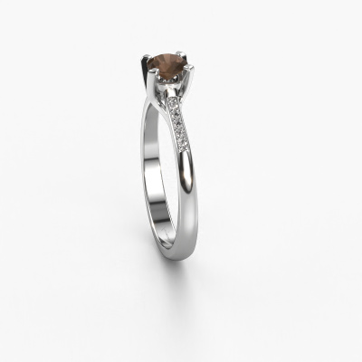Nous avons donné le nom Isa 2 à la bague de fiançailles mentionnée ci-dessous. Ce type de bague de fiançailles est appelé une bague de fiançailles solitaire pavé car elle ne comporte qu’une seule pierre centrale et les tiges de la bague de fiançailles ont également une finition pleine. Cette bague de fiançailles est forgée en or 14 Carat et comporte un quartz fumé ronds de 4.2 mm. Des diamants sont sertis dans les épaules latérales de l’anneau. Chaque bijou est faite pour briller sur votre doigt, chaque bijou est fabriqué à la main par nos orfèvres.. Cette bague de fiançailles solitaire pavé forgée en or blanc classiques a un beau quartz fumé ronds en guise de pierre centrale, avec plus de diamants dans l’anneau pour accentuer encore plus l’effet de la pierre centrale. Le sertissage à griffes autour du quartz fumé étant ouvert, le quartz fumé capte la lumière de tous les côtés et brille de manière optimale. Ci-dessus, vous pouvez voir comment notre orfèvre a travaillé la bague de fiançailles dans les moindres détails. de telle sorte que le quartz fumé élevé puisse véritablement attirer tous les regards. Quelle belle bague de fiançailles à offre lors de votre demande en mariage à l'amour de votre vie, à votre centre rayonnant ! Saviez-vous que nous offrons la garantie du meilleur prix pour votre bague de fiançailles? Cela est possible car tous nos bijoux sont fabriqués à la main dans notre propre atelier. Nous n'avons pas de frais de stocks qui sont coûteux, et nous fabriquons votre bague uniquement une fois que vous l'avez commandée. Grâce au fait que nous ayons toute la production du bijou en main, nous pouvons vous informer sur toutes les caractéristiques de cette bague de fiançailles. C’est précisément parce que l’achat d’une bague en ligne est une expérience excitante que nous comprenons qu’il est plus confortable pour vous de connaître toutes les caractéristiques de votre bague.Notre équipe ajoute quotidiennement de nouveaux modèles à notre collection en ligne. Nos designers et orfèvres travaillent ensemble pour créer le meilleur design. Nous nous efforçons d'offrir une collection diversifiée de bijoux. Peut-être avez-vous déjà en tête un bijou en particulier ? Un bijou que vous avez trouvé quelque part. Veuillez nous contacter pour une consultation gratuite. Nous vous ferons une offre, basée sur un rapport qualité / prix juste, qui vous déconcertera.Pour vous faciliter la tâche, vous pouvez facilement nous retourner tout bijou commandé dans les 30 jours suivant la livraison.