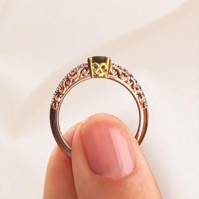 Cette bague de fiançailles porte le nom Mellie. Cette bague de fiançailles forgée en or 14 Carat est sertie d’un quartz fumé de 5 mm. Qu'est-ce qui rend votre relation unique ? Qu'est-ce que qui fait que vous souhaitiez qu’elle devienne votre femmes ? Cet anneau unique que vous avez ensemble peut être reflété dans une bague unique. Une bague de fiançailles solitaire pavé unique qui est seulement créée pour elle. Et c'est la raison pour laquelle cette bague de fiançailles lui ira parfaitement. Chaque détail de cette bague de fiançailles ci-dessous forgée en or rose sertie d’un quartz fumé est composée, travaillée et polie à la main par notre orfèvre dans notre atelier. Le résultat final est une magnifique bague de fiançailles, unique et parfaitement forgée dans les moindres détails ! Ce résultat est ce que nos orfèvres recherchent à tout prix ! Ce bijou est fabriquée par une équipe d'orfèvres et de designers motivés. Cela permettra à cette pièce unique d'attirer tous les regards.Vous avez peut-être remarqué que nos prix sont en moyenne inférieurs de 30% à ceux d'un autre bijoutier. Et ce alors que la qualité de nos bijoux est même plus élevée dans la plupart des cas ! En effet, nos orfèvres fabriquent votre bague de fiançailles directement dans notre propre atelier. Cela signifie que nous n'avons pas à inclure des frais de stocks coûteux et que nous pouvons travailler n'importe quel détail directement sur votre bague de fiançailles.Avez-vous déjà des bague de fiançailles spécifiques en tête ? Une bague de fiançailles que vous avez vu quelque part. N'hésitez pas à nous faire part de vos souhaits et nous transformerons votre design en des bague de fiançailles uniques. Vous êtes en mesure de suivre l'évolution de la conception de vos bague de fiançailles car nous utilisons des dessins en 3D. Cela vous donnera un aperçu réaliste de votre design. Nous vous enverrons volontiers une offre sans engagement basée sur un rapport qualité / prix juste. Elle va vous étonner.Pour vous faciliter la tâche, vous pouvez facilement nous retourner tout bijou commandé dans les 30 jours suivant la livraison.