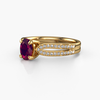 La bague de fiançailles mentionnée ci-dessus a été nommée Antonia ovl 2. Ce type de bague de fiançailles est appelé une bague de fiançailles solitaire pavé car elle ne comporte qu’une seule pierre centrale et les tiges de la bague de fiançailles sont également pleins. La bague de fiançailles est faite dans une combinaison d'or 14 Carat et d’or jaune et a un rhodolite ovale d’une de 7x5 mm, et des diamants sont sertis sur les épaules de l’anneau. Chaque bijou est unique car vous pouvez entièrement l'assembler à votre guise. Cette bague de fiançailles solitaire pavé forgée en or jaune contemporains a un beau rhodolites ovale comme pierre centrale, avec plus de rhodolites sertis dans la bague pour accentuer encore plus la présence de la pierre centrale. Le sertissage à griffes autour du rhodolite étant ouvert, le rhodolite capte la lumière de tous les côtés et brille de manière optimale. Ci-dessus, vous pouvez voir comment notre orfèvre travaille la bague de fiançailles avec une extrême précision dans les moindres détails, de telle sorte que le rhodolite élevé puisse attirer tous les regards. Quelle belle bague de fiançailles à offrir lors de votre demande en mariage à l'amour de votre vie, à votre centre rayonnant ! En combinant les dernières techniques modernes, associées à une fabrication ancienne, nous sommes en mesure de fabriquer nos bagues de fiançailles dans notre propre studio. Chaque bijou est fabriqué sur commande. Ceci est avantageux car nous sommes en mesure de vous proposer un prix que vous ne trouverez nulle part ailleurs.Notre équipe ajoute quotidiennement de nouveaux modèles à notre collection en ligne. Nos designers et orfèvres travaillent ensemble pour créer le meilleur design. Nous nous efforçons d'offrir une collection diversifiée de bijoux. Peut-être avez-vous déjà en tête un bijou en particulier ? Un bijou que vous avez trouvé quelque part. Veuillez nous contacter pour une consultation gratuite. Nous vous ferons une offre, basée sur un rapport qualité / prix juste, qui vous déconcertera.Pour vous faciliter la tâche, vous pouvez facilement nous retourner tout bijou commandé dans les 30 jours suivant la livraison.