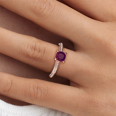 Nous avons donné le nom Elenore cus à la bague de fiançailles mentionnée ci-dessous. Ce type de bague de fiançailles est appelé une bague de fiançailles solitaire pavé car elle ne comporte qu’une seule pierre centrale et les tiges de la bague de fiançailles ont également une finition pleine. Cette bague de fiançailles est forgée en or 14 Carat et comporte un rhodolite coussin de 5.5 mm. Des diamants synthétiques sont sertis dans les épaules latérales de l’anneau. Chaque bijou est fabriquée par une équipe d'orfèvres et de designers motivés. Cela permettra à cette pièce unique d'attirer tous les regards.. Cette bague de fiançailles solitaire pavé forgée en or rose contemporains a un beau rhodolite coussin en guise de pierre centrale, avec plus de diamants synthétiques dans l’anneau pour accentuer encore plus l’effet de la pierre centrale. Le sertissage à griffes autour du rhodolite étant ouvert, le rhodolite capte la lumière de tous les côtés et brille de manière optimale. Ci-dessus, vous pouvez voir comment notre orfèvre a travaillé la bague de fiançailles dans les moindres détails. de telle sorte que le rhodolite élevé puisse véritablement attirer tous les regards. Quelle belle bague de fiançailles à offre lors de votre demande en mariage à l'amour de votre vie, à votre centre rayonnant ! Nos orfèvres ne fabriqueront votre bague de fiançailles qu'une fois que vous l'aurez commandée. Nous ne faisons pas de stock. L'avantage de cela est que nous n'avons pas à inclure les frais de stockage dans nos prix, et nous pouvons donc vous offrir des bijoux à un prix très bas.Avez-vous déjà des bague de fiançailles spécifiques en tête ? Une bague de fiançailles que vous avez vu quelque part. N'hésitez pas à nous faire part de vos souhaits et nous transformerons votre design en des bague de fiançailles uniques. Vous êtes en mesure de suivre l'évolution de la conception de vos bague de fiançailles car nous utilisons des dessins en 3D. Cela vous donnera un aperçu réaliste de votre design. Nous vous enverrons volontiers une offre sans engagement basée sur un rapport qualité / prix juste. Elle va vous étonner.Pour vous faciliter la tâche, vous pouvez facilement nous retourner tout bijou commandé dans les 30 jours suivant la livraison.
