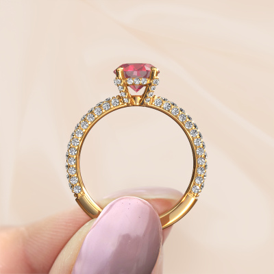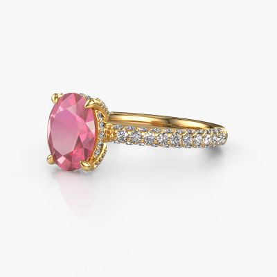 La bague de fiançailles mentionnée ci-dessus a été nommée Saskia 2 ovl. Ce type de bague de fiançailles est appelé une bague de fiançailles solitaire pavé car elle ne comporte qu’une seule pierre centrale et les tiges de la bague de fiançailles sont également pleins. La bague de fiançailles est faite dans une combinaison d'or 14 Carat et d’or jaune et a un rose tourmaline ovale d’une de 9x7 mm, et des diamants synthétiques sont sertis sur les épaules de l’anneau. Chaque bijou est fabriquée spécialement pour vous par nos maîtres orfèvres dans notre propre atelier. Cette bague de fiançailles solitaire pavé forgée en or jaune exclusives a un beau rose tourmaline ovale comme pierre centrale, avec plus de rose tourmaline sertis dans la bague pour accentuer encore plus la présence de la pierre centrale. Le sertissage à griffes autour du rose tourmaline étant ouvert, le rose tourmaline capte la lumière de tous les côtés et brille de manière optimale. Ci-dessus, vous pouvez voir comment notre orfèvre travaille la bague de fiançailles avec une extrême précision dans les moindres détails, de telle sorte que le rose tourmaline élevé puisse attirer tous les regards. Quelle belle bague de fiançailles à offrir lors de votre demande en mariage à l'amour de votre vie, à votre centre rayonnant ! Saviez-vous que nous offrons la garantie du meilleur prix pour votre bague de fiançailles? Cela est possible car tous nos bijoux sont fabriqués à la main dans notre propre atelier. Nous n'avons pas de frais de stocks qui sont coûteux, et nous fabriquons votre bague uniquement une fois que vous l'avez commandée. Grâce au fait que nous ayons toute la production du bijou en main, nous pouvons vous informer sur toutes les caractéristiques de cette bague de fiançailles. C’est précisément parce que l’achat d’une bague en ligne est une expérience excitante que nous comprenons qu’il est plus confortable pour vous de connaître toutes les caractéristiques de votre bague.Avez-vous déjà des bague de fiançailles spécifiques en tête ? Une bague de fiançailles que vous avez vu quelque part. N'hésitez pas à nous faire part de vos souhaits et nous transformerons votre design en des bague de fiançailles uniques. Vous êtes en mesure de suivre l'évolution de la conception de vos bague de fiançailles car nous utilisons des dessins en 3D. Cela vous donnera un aperçu réaliste de votre design. Nous vous enverrons volontiers une offre sans engagement basée sur un rapport qualité / prix juste. Elle va vous étonner.Pour vous faciliter la tâche, vous pouvez facilement nous retourner tout bijou commandé dans les 30 jours suivant la livraison.