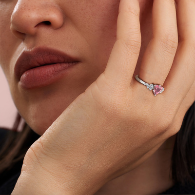 Le nom de cette bague de fiançailles est Royce TRI. Elle est forgée en or et est sertie d'un rose tourmaline de 7 mm. Comment décririez-vous le style de l'amour de votre vie ? Est-ce qu'elle aime quelque chose qui est juste un peu plus