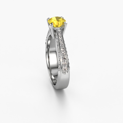 Nous avons donné le nom Ruby rnd à la bague de fiançailles mentionnée ci-dessous. Ce type de bague de fiançailles est appelé une bague de fiançailles solitaire pavé car elle ne comporte qu’une seule pierre centrale et les tiges de la bague de fiançailles ont également une finition pleine. Cette bague de fiançailles est forgée en or 14 Carat et comporte un saphir jaune ronds de 5.7 mm. Des diamants sont sertis dans les épaules latérales de l’anneau. Chaque bijou est faite spécialement pour vous, avec une attention particulière portée aux détails et au design.. Cette bague de fiançailles solitaire pavé forgée en or blanc exclusives a un beau saphir jaune ronds en guise de pierre centrale, avec plus de diamants dans l’anneau pour accentuer encore plus l’effet de la pierre centrale. Le sertissage à griffes autour du saphir jaune étant ouvert, le saphir jaune capte la lumière de tous les côtés et brille de manière optimale. Ci-dessus, vous pouvez voir comment notre orfèvre a travaillé la bague de fiançailles dans les moindres détails. de telle sorte que le saphir jaune élevé puisse véritablement attirer tous les regards. Quelle belle bague de fiançailles à offre lors de votre demande en mariage à l'amour de votre vie, à votre centre rayonnant ! Puisque nous concevons et livrons nos propres bijoux, nous sommes en mesure de vous proposer une bague de fiançailles à un prix que vous ne pourrez pas trouver ailleurs. Une alliance est fabriquée sur commande, ce qui permet d'éviter les excédents de matériel et nous permet de vous proposer une superbe offre de prix. Nous comprenons qu'acheter votre bague de fiançailles en ligne soit un risque, mais nous vous assistons volontiers dans le processus de conception, en tenant compte de votre budget.Avez-vous déjà des bague de fiançailles spécifiques en tête ? Une bague de fiançailles que vous avez vu quelque part. N'hésitez pas à nous faire part de vos souhaits et nous transformerons votre design en des bague de fiançailles uniques. Vous êtes en mesure de suivre l'évolution de la conception de vos bague de fiançailles car nous utilisons des dessins en 3D. Cela vous donnera un aperçu réaliste de votre design. Nous vous enverrons volontiers une offre sans engagement basée sur un rapport qualité / prix juste. Elle va vous étonner.Pour vous faciliter la tâche, vous pouvez facilement nous retourner tout bijou commandé dans les 30 jours suivant la livraison.