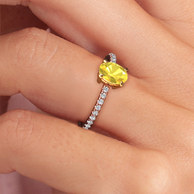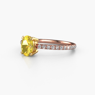 Nous avons donné le nom Lynelle 2 à la bague de fiançailles mentionnée ci-dessous. Ce type de bague de fiançailles est appelé une bague de fiançailles solitaire pavé car elle ne comporte qu’une seule pierre centrale et les tiges de la bague de fiançailles ont également une finition pleine. Cette bague de fiançailles est forgée en or 14 Carat et comporte un saphir jaune ovale de 7x5 mm. Des diamants sont sertis dans les épaules latérales de l’anneau. Chaque bijou est faite pour briller sur votre doigt, chaque bijou est fabriqué à la main par nos orfèvres.. Cette bague de fiançailles solitaire pavé forgée en or rose classiques a un beau saphir jaune ovale en guise de pierre centrale, avec plus de diamants dans l’anneau pour accentuer encore plus l’effet de la pierre centrale. Le sertissage à griffes autour du saphir jaune étant ouvert, le saphir jaune capte la lumière de tous les côtés et brille de manière optimale. Ci-dessus, vous pouvez voir comment notre orfèvre a travaillé la bague de fiançailles dans les moindres détails. de telle sorte que le saphir jaune élevé puisse véritablement attirer tous les regards. Quelle belle bague de fiançailles à offre lors de votre demande en mariage à l'amour de votre vie, à votre centre rayonnant ! Nos orfèvres ne fabriqueront votre bague de fiançailles qu'une fois que vous l'aurez commandée. Nous ne faisons pas de stock. L'avantage de cela est que nous n'avons pas à inclure les frais de stockage dans nos prix, et nous pouvons donc vous offrir des bijoux à un prix très bas.Avez-vous déjà des bague de fiançailles spécifiques en tête ? Une bague de fiançailles que vous avez vu quelque part. N'hésitez pas à nous faire part de vos souhaits et nous transformerons votre design en des bague de fiançailles uniques. Vous êtes en mesure de suivre l'évolution de la conception de vos bague de fiançailles car nous utilisons des dessins en 3D. Cela vous donnera un aperçu réaliste de votre design. Nous vous enverrons volontiers une offre sans engagement basée sur un rapport qualité / prix juste. Elle va vous étonner.Pour vous faciliter la tâche, vous pouvez facilement nous retourner tout bijou commandé dans les 30 jours suivant la livraison.