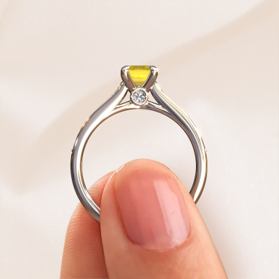 La bague de fiançailles mentionnée ci-dessus a été nommée Valorie eme 2. Ce type de bague de fiançailles est appelé une bague de fiançailles solitaire pavé car elle ne comporte qu’une seule pierre centrale et les tiges de la bague de fiançailles sont également pleins. La bague de fiançailles est faite dans une combinaison d'or et d’platine et a un saphir jaune taille émeraude d’une de 6.5x4.5 mm, et des diamants sont sertis sur les épaules de l’anneau. Chaque bijou est fabriquée par une équipe d'orfèvres et de designers motivés. Cela permettra à cette pièce unique d'attirer tous les regards. Cette bague de fiançailles solitaire pavé forgée en platine classiques a un beau saphirs jaunes taille émeraude comme pierre centrale, avec plus de saphirs jaunes sertis dans la bague pour accentuer encore plus la présence de la pierre centrale. Le sertissage à griffes autour du saphir jaune étant ouvert, le saphir jaune capte la lumière de tous les côtés et brille de manière optimale. Ci-dessus, vous pouvez voir comment notre orfèvre travaille la bague de fiançailles avec une extrême précision dans les moindres détails, de telle sorte que le saphir jaune élevé puisse attirer tous les regards. Quelle belle bague de fiançailles à offrir lors de votre demande en mariage à l'amour de votre vie, à votre centre rayonnant ! Qu'y a-t-il dorénavant de plus beau qu'une bague de fiançailles classiques conçue par vous-même et fabriquée à la main par nous. Vous pouvez personnaliser chaque modèle avec les différents métaux précieux et pierres précieuses. De cette façon, vous pourrez créer une bague de fiançailles unique. Cette bague peut être mise en place de plusieurs façons. Bien sûr, vous pouvez toujours nous contacter et nous serons heureux de vous aider à composer votre bague de fiançailles classiques Valorie eme 2. Vous aimez le design, mais vous souhaitez tout de même quelque chose qui vous convienne plus, ou bien vous souhaitez une pierre précieuse dans les bijoux que vous ne pouvez pas choisir sur notre site, contactez-nous et nous vous aiderons.Avez-vous déjà des bague de fiançailles spécifiques en tête ? Une bague de fiançailles que vous avez vu quelque part. N'hésitez pas à nous faire part de vos souhaits et nous transformerons votre design en des bague de fiançailles uniques. Vous êtes en mesure de suivre l'évolution de la conception de vos bague de fiançailles car nous utilisons des dessins en 3D. Cela vous donnera un aperçu réaliste de votre design. Nous vous enverrons volontiers une offre sans engagement basée sur un rapport qualité / prix juste. Elle va vous étonner.Pour vous faciliter la tâche, vous pouvez facilement nous retourner tout bijou commandé dans les 30 jours suivant la livraison.