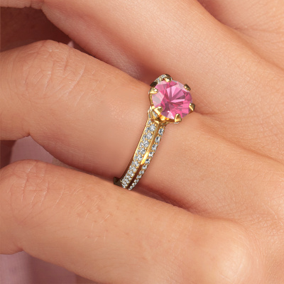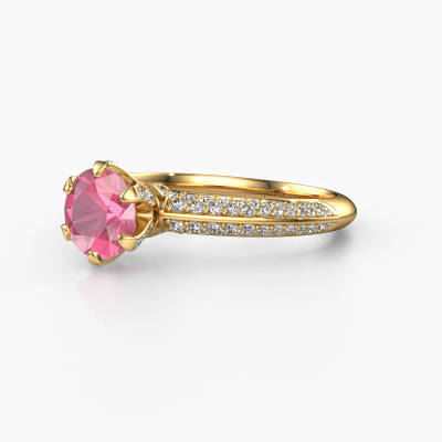 La bague de fiançailles mentionnée ci-dessus a été nommée Abby. Ce type de bague de fiançailles est appelé une bague de fiançailles solitaire pavé car elle ne comporte qu’une seule pierre centrale et les tiges de la bague de fiançailles sont également pleins. La bague de fiançailles est faite dans une combinaison d'or 14 Carat et d’or jaune et a un saphir rose ronds d’une de 6.5 mm, et des diamants sont sertis sur les épaules de l’anneau. Chaque bijou est fabriquées spécialement pour vous par nos maîtres orfèvres dans notre propre atelier. Cette bague de fiançailles solitaire pavé forgée en or jaune exclusives a un beau saphirs roses ronds comme pierre centrale, avec plus de saphirs roses sertis dans la bague pour accentuer encore plus la présence de la pierre centrale. Le sertissage à griffes autour du saphir rose étant ouvert, le saphir rose capte la lumière de tous les côtés et brille de manière optimale. Ci-dessus, vous pouvez voir comment notre orfèvre travaille la bague de fiançailles avec une extrême précision dans les moindres détails, de telle sorte que le saphir rose élevé puisse attirer tous les regards. Quelle belle bague de fiançailles à offrir lors de votre demande en mariage à l'amour de votre vie, à votre centre rayonnant ! Vous avez peut-être remarqué que nos prix sont en moyenne inférieurs de 30% à ceux d'un autre bijoutier. Et ce alors que la qualité de nos bijoux est même plus élevée dans la plupart des cas ! En effet, nos orfèvres fabriquent votre bague de fiançailles directement dans notre propre atelier. Cela signifie que nous n'avons pas à inclure des frais de stocks coûteux et que nous pouvons travailler n'importe quel détail directement sur votre bague de fiançailles.Notre équipe ajoute quotidiennement de nouveaux modèles à notre collection en ligne. Nos designers et orfèvres travaillent ensemble pour créer le meilleur design. Nous nous efforçons d'offrir une collection diversifiée de bijoux. Peut-être avez-vous déjà en tête un bijou en particulier ? Un bijou que vous avez trouvé quelque part. Veuillez nous contacter pour une consultation gratuite. Nous vous ferons une offre, basée sur un rapport qualité / prix juste, qui vous déconcertera.Pour vous faciliter la tâche, vous pouvez facilement nous retourner tout bijou commandé dans les 30 jours suivant la livraison.