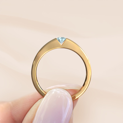 Cette bague de fiançailles porte le nom de Theresia. La bague de fiançailles est en or 14 carats et avec un aigue-marine de 3.4 mm. Le large de cette bague de fiançailles à tension est que l'attention est vraiment attirée sur le aigue-marine. Notre orfèvre utilise des techniques spéciales pour la fabrication de cette bague de fiançailles, de sorte que le aigue-marine soit calé par l'anneau de la bague forgée en or jaune. En conséquence, la lumière a beaucoup de jeu libre sur la pierre précieuse, ce qui crée un bel éclat et une belle allure. Une belle pièce d'artisanat ! Le résultat est une bague unique, d'aspect modernes, réalisée à la main avec passion par notre orfèvre, spécialement pour l'amour de votre vie ! Nous recommandons une pierre un peu plus dure pour cette bague de fiançailles, telle qu'un diamant ou un saphire, en raison des grandes forces exercées sur la pierre précieuse. Ce bijou est fabriquée spécialement pour vous par nos maîtres orfèvres dans notre propre atelier. Qu'y a-t-il dorénavant de plus beau qu'une bague de fiançailles modernes conçue par vous-même et fabriquée à la main par nous. Vous pouvez personnaliser chaque modèle avec les différents métaux précieux et pierres précieuses. De cette façon, vous pourrez créer une bague de fiançailles unique. Cette bague peut être mise en place de plusieurs façons. Bien sûr, vous pouvez toujours nous contacter et nous serons heureux de vous aider à composer votre bague de fiançailles modernes Theresia. Vous aimez le design, mais vous souhaitez tout de même quelque chose qui vous convienne plus, ou bien vous souhaitez une pierre précieuse dans les bijoux que vous ne pouvez pas choisir sur notre site, contactez-nous et nous vous aiderons. Notre équipe ajoute quotidiennement de nouveaux modèles à notre collection en ligne. Nos designers et orfèvres travaillent ensemble pour créer le meilleur design. Nous nous efforçons d'offrir une collection diversifiée de bijoux. Peut-être avez-vous déjà en tête un bijou en particulier ? Un bijou que vous avez trouvé quelque part. Veuillez nous contacter pour une consultation gratuite. Nous vous ferons une offre, basée sur un rapport qualité / prix juste, qui vous déconcertera. Pour vous faciliter la tâche, vous pouvez facilement nous retourner tout bijou commandé dans les 30 jours suivant la livraison.