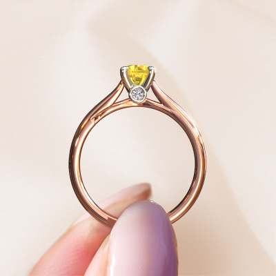 Nous avons donné le nom Valorie RND 1 à la bague de fiançailles mentionnée ci-dessous. Ce type de bague de fiançailles est appelée une bague de fiançailles solitaire car elle ne contient qu’une seule pierre précieuse. La bague de fiançailles est forgée en or 14 Carat et comporte un saphir jaune ronds d’une la de 5 mm. Cette bague de fiançailles solitaire forgée en or rose modernes sertie d’un beau saphir jaune ronds est une magnifique bague de fiançailles. Grâce au fait que le sertissage de chaton soit ouvert, l’effet de lumière sur la pierre précieuse est optimal. Nous plaçons également la pierre précieuse en élévation sur la bague, ce qui la rendra encore plus frappante. Par exemple, le diamants est une belle pierre précieuse à offrir à l'amour de votre vie, car il symbolise l'amour éternel et la pureté. Et ce symbole rayonne au milieu de cette bague solitaire. Ainsi, chaque pierre précieuse a une belle signification symbolique. Vous pouvez concevoir vous-même cette bague de fiançailles solitaire dans différentes combinaisons de métaux précieux. Celle-ci a une combinaison d'or 14 Carat avec or de l’rouge. Chaque bijou est faite spécialement pour vous, avec une attention particulière portée aux détails et au design.Qu'y a-t-il dorénavant de plus beau qu'une bague de fiançailles modernes conçue par vous-même et fabriquée à la main par nous. Vous pouvez personnaliser chaque modèle avec les différents métaux précieux et pierres précieuses. De cette façon, vous pourrez créer une bague de fiançailles unique. Cette bague peut être mise en place de plusieurs façons. Bien sûr, vous pouvez toujours nous contacter et nous serons heureux de vous aider à composer votre bague de fiançailles modernes Valorie RND 1. Vous aimez le design, mais vous souhaitez tout de même quelque chose qui vous convienne plus, ou bien vous souhaitez une pierre précieuse dans les bijoux que vous ne pouvez pas choisir sur notre site, contactez-nous et nous vous aiderons.Avez-vous déjà des bague de fiançailles spécifiques en tête ? Une bague de fiançailles que vous avez vu quelque part. N'hésitez pas à nous faire part de vos souhaits et nous transformerons votre design en des bague de fiançailles uniques. Vous êtes en mesure de suivre l'évolution de la conception de vos bague de fiançailles car nous utilisons des dessins en 3D. Cela vous donnera un aperçu réaliste de votre design. Nous vous enverrons volontiers une offre sans engagement basée sur un rapport qualité / prix juste. Elle va vous étonner.Pour vous faciliter la tâche, vous pouvez facilement nous retourner tout bijou commandé dans les 30 jours suivant la livraison.