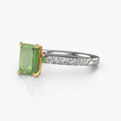 Nous avons donné le nom Crystal EME 2 à la bague de fiançailles mentionnée ci-dessous. Ce type de bague de fiançailles est appelée une bague de fiançailles solitaire car elle ne contient qu’une seule pierre précieuse. La bague de fiançailles est forgée en or 14 Carat et comporte un vert tourmaline taille émeraude d’une la de 8x6 mm. Cette bague de fiançailles solitaire forgée en or blanc exclusives sertie d’un beau vert tourmaline taille émeraude est une magnifique bague de fiançailles. Grâce au fait que le sertissage de chaton soit ouvert, l’effet de lumière sur la pierre précieuse est optimal. Nous plaçons également la pierre précieuse en élévation sur la bague, ce qui la rendra encore plus frappante. Par exemple, le diamants est une belle pierre précieuse à offrir à l'amour de votre vie, car il symbolise l'amour éternel et la pureté. Et ce symbole rayonne au milieu de cette bague solitaire. Ainsi, chaque pierre précieuse a une belle signification symbolique. Vous pouvez concevoir vous-même cette bague de fiançailles solitaire dans différentes combinaisons de métaux précieux. Celle-ci a une combinaison d'or 14 Carat avec or de l’rouge. Chaque bijou est fabriquée spécialement pour vous par nos maîtres orfèvres dans notre propre atelier.En combinant les dernières techniques modernes, associées à une fabrication ancienne, nous sommes en mesure de fabriquer nos bagues de fiançailles dans notre propre studio. Chaque bijou est fabriqué sur commande. Ceci est avantageux car nous sommes en mesure de vous proposer un prix que vous ne trouverez nulle part ailleurs.Notre équipe ajoute quotidiennement de nouveaux modèles à notre collection en ligne. Nos designers et orfèvres travaillent ensemble pour créer le meilleur design. Nous nous efforçons d'offrir une collection diversifiée de bijoux. Peut-être avez-vous déjà en tête un bijou en particulier ? Un bijou que vous avez trouvé quelque part. Veuillez nous contacter pour une consultation gratuite. Nous vous ferons une offre, basée sur un rapport qualité / prix juste, qui vous déconcertera.Pour vous faciliter la tâche, vous pouvez facilement nous retourner tout bijou commandé dans les 30 jours suivant la livraison.